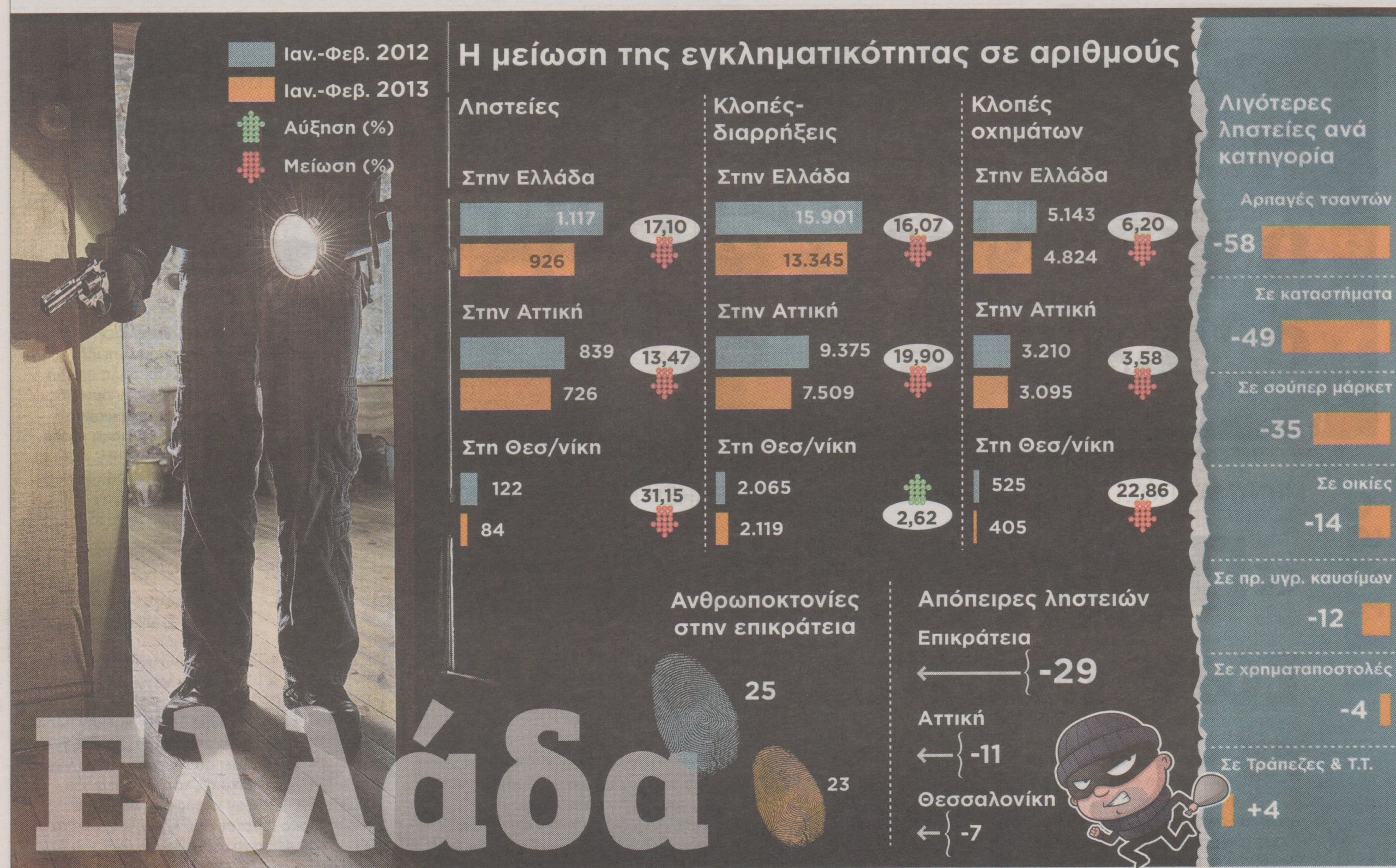 Αισθητή μείωση στα σοβαρά εγκλήματα αλλά και στη μικροεγκληματικότητα του δρόμου καταγράφεται σε όλη τη χώρα το πρώτο δίμηνο του 2013 σε σχέση με το αντίστοιχο περσινό διάστημα, σύμφωνα με τα επίσημα στατιστικά στοιχεία της αστυνομίας.