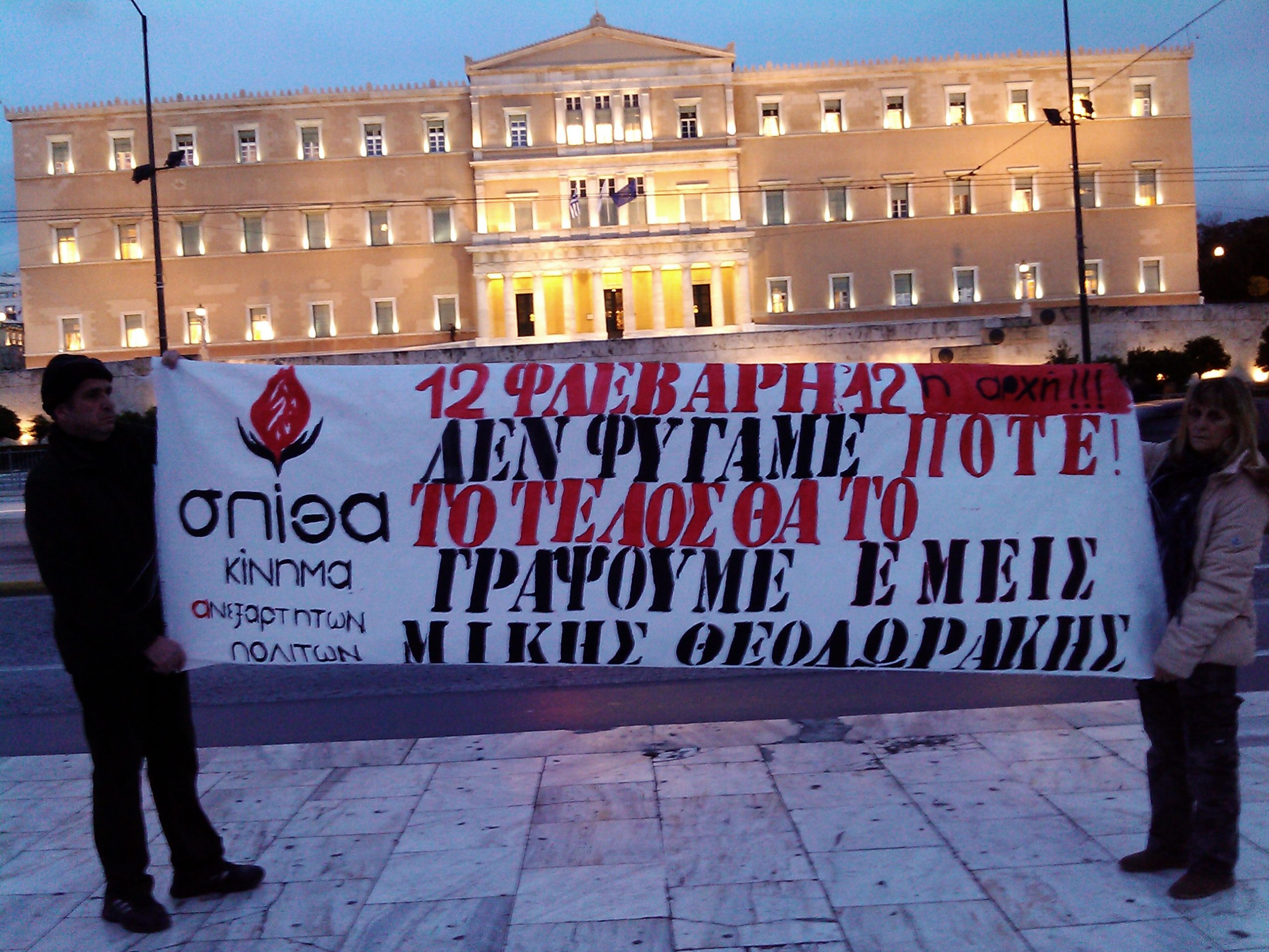 «Μέλη της Σπίθας Αττικής βρίσκονται στην πλατεία από το μεσημέρι για να θυμίσουν στους πολίτες την αντίστοιχη περσινή ημέρα της 12ης Φεβρουαρίου του 2012, όταν ο Μίκης Θεοδωράκης μαζί με εκατοντάδες χιλιάδες πολίτες διαδήλωναν στην πλατεία Συντάγματος, των ώρα που μέσα στη Βουλή ψηφιζόταν το Μνημόνιο 2. Η συγκέντρωση τότε, λίγο έλειψε να καταλήξει σε λουτρό αίματος, όταν τα ΜΑΤ με πρωτοφανή αγριότητα επιτέθηκαν στους πολίτες, ακόμα και στον ίδιο το Μίκη Θεοδωράκη στον οποίο προξένησαν ανεπανόρθωτες βλάβες στην υγεία του.