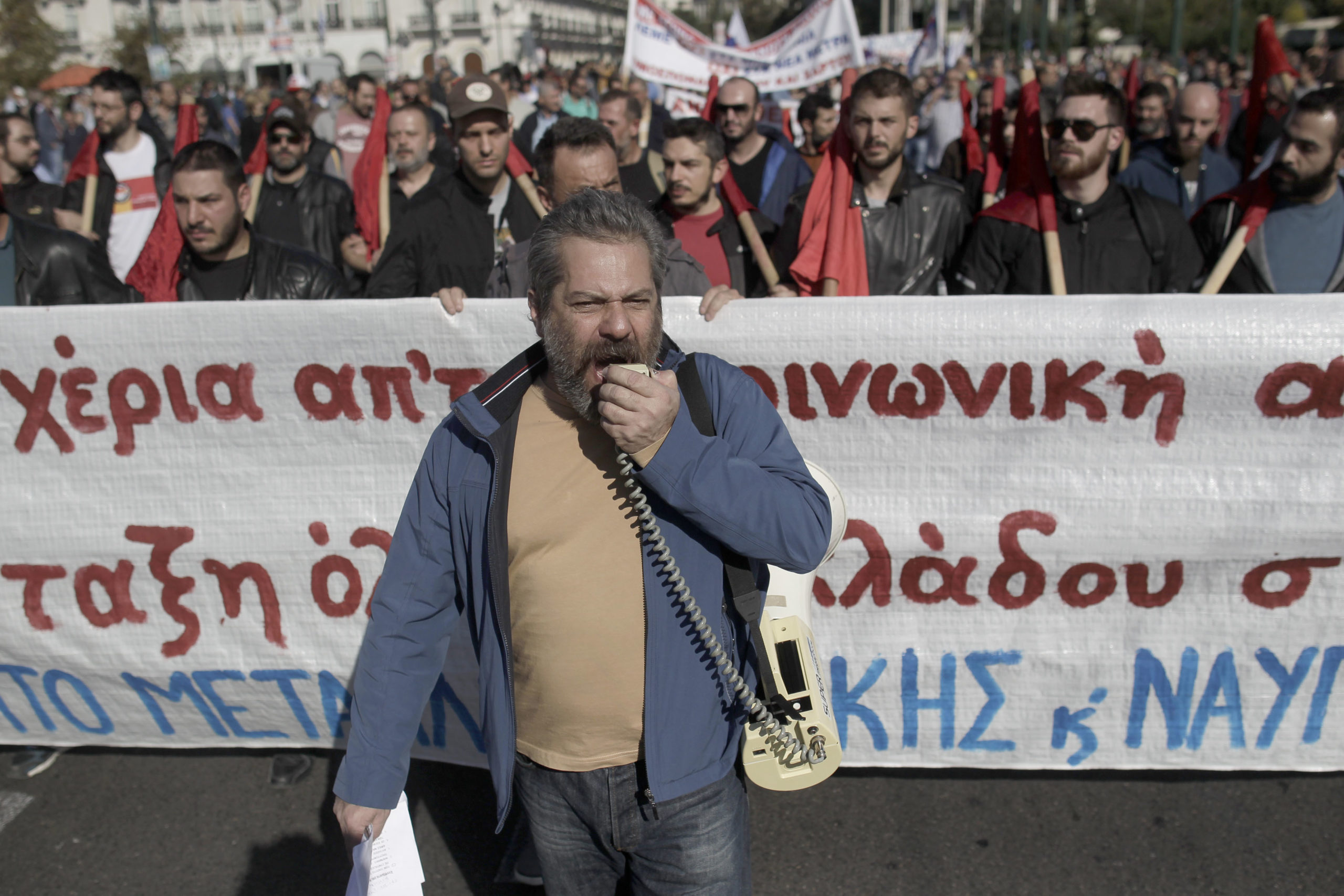 Μέλη του ΠΑΜΕ φωνάζουν συνθήματα κατά τη διάρκεια πορείας στο κέντρο της Αθήνας. «Παραλύει» σήμερα ο δημόσιος και ιδιωτικός τομέας της χώρας, λόγω της εικοσιτετράωρης γενικής απεργίας των ΓΣΕΕ και ΑΔΕΔΥ ενάντια στις επερχόμενες αλλαγές στο ασφαλιστικό, τη φορολογία, τα «κόκκινα δάνεια», κ.α.