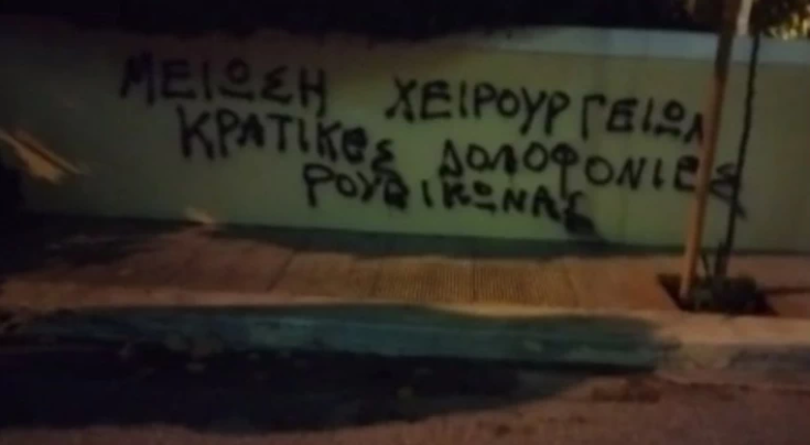 Μέλη του Ρουβίκωνα έγραψαν σύνθημα στην περίφραξη του σπιτιού της αναπληρώτριας υπουργού Υγείας, Μίνας Γκάγκα, με αφορμή τον περιορισμό των τακτικών χειρουργείων στα νοσοκομεία.