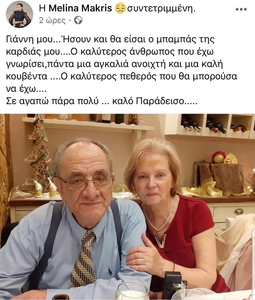 Η τραγουδίστρια δημοσίευσε μία φωτογραφία του πεθερού της, γράφοντας χαρακτηριστικά: «Γιάννη μου…Ήσουν και θα είσαι ο μπαμπάς της καρδιάς μου….Ο καλύτερος άνθρωπος που έχω γνωρίσει, πάντα μια αγκαλιά ανοιχτή και μια καλή κουβέντα ….Ο καλύτερος πεθερός που θα μπορούσα να έχω…. Σε αγαπώ πάρα πολύ … καλό Παράδεισο…..».