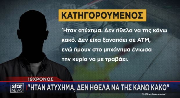 Ο 19χρονος δήλωσε για το περιστατικό: «Ήταν ατύχημα. Δεν ήθελα να της κάνω κακό. Δεν είχα ξαναπάει σε ΑΤΜ, ενώ ήμουν στο μηχάνημα, ένιωσα την κυρία να με τραβάει. Προσπάθησα να την απωθήσω και έπεσε. Ζητώ συγγνώμη. Δεν τη χτύπησα». Εις βάρος του, ασκήθηκε δίωξη για βαριά σωματική βλάβη, παραπέμφθηκε στο Αυτόφωρο για να δικαστεί και έλαβε προθεσμία για αύριο Παρασκευή (01/11).
