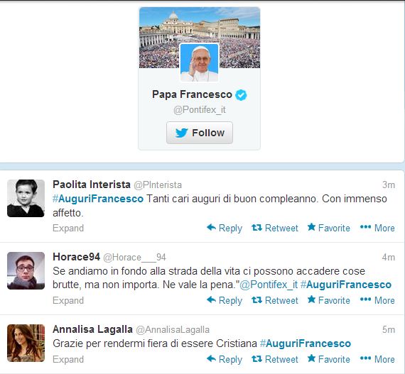 Χιλιάδες πιστοί εύχονται επίσης χρόνια πολλά στον ποντίφικα μέσω του ιστοτόπου κοινωνικής δικτύωσης Twitter, με την ετικέτα (hashtag) #augurifrancesco (ευχές στον Φραγκίσκο).