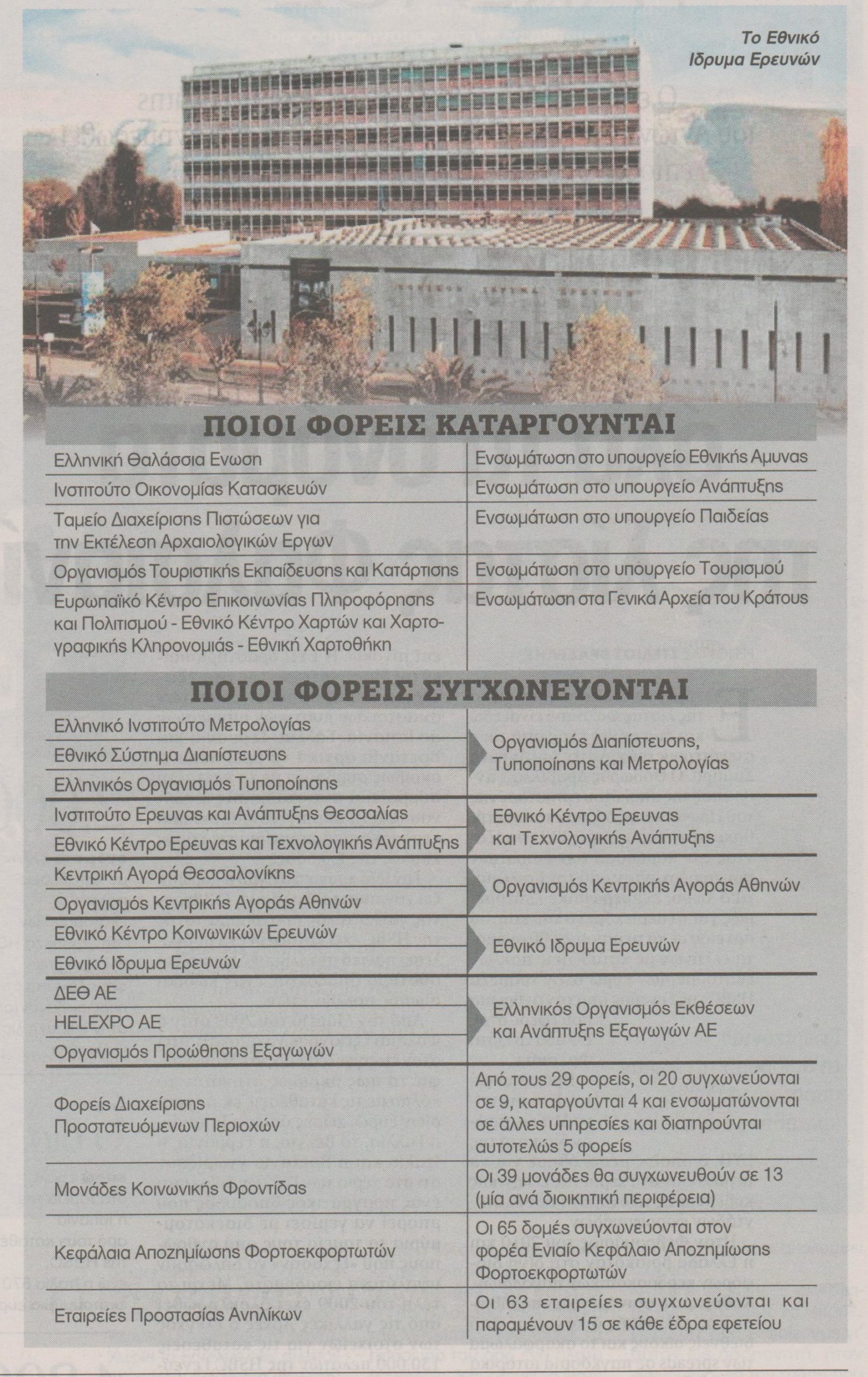 Με υποχρεωτικές μετακινήσεις προσωπικού αλλά χωρίς απολύσεις συνοδεύεται το πρώτο κύμα συγχωνεύσεων και καταργήσεων 21 φορέων του Δημοσίου.Πόρτα εξόδου από το Δημόσιο ενδέχεται ωστόσο να περιμένει τους εργαζομένους σε φορείς που θα τεθούν σε επόμενη φάση από συγχώνευση ή κατάργηση.Στην παρούσα διαδικασία επηρεάζονται 5.256 εργαζόμενοι που υπηρετούν στους 21 φορείς και στην πλειονότητά τους -όσοι δηλαδή είναι στους 16 φορείς που συγχωνεύονται- θα μεταφερθούν στους νέους οργανισμούς που θα προκύψουν. ΠΑΤΗΣΤΕ ΠΑΝΩ ΣΤΟΝ ΠΙΝΑΚΑ ΓΙΑ ΜΕΓΑΛΥΤΕΡΗ ΑΝΑΛΥΣΗ