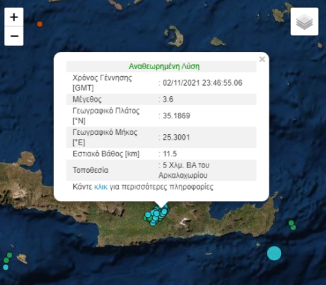 Συνεχίζεται η μετασεισμική ακολουθία στην περιοχή στο  Αρκαλοχώρι, στην Κρήτη. Μία ώρα και 46 λεπτά μετά τα μεσάνυχτα, στην περιοχή καταγράφηκε νέος σεισμός μεγέθους 3,6 βαθμών της κλίμακας Ρίχτερ.