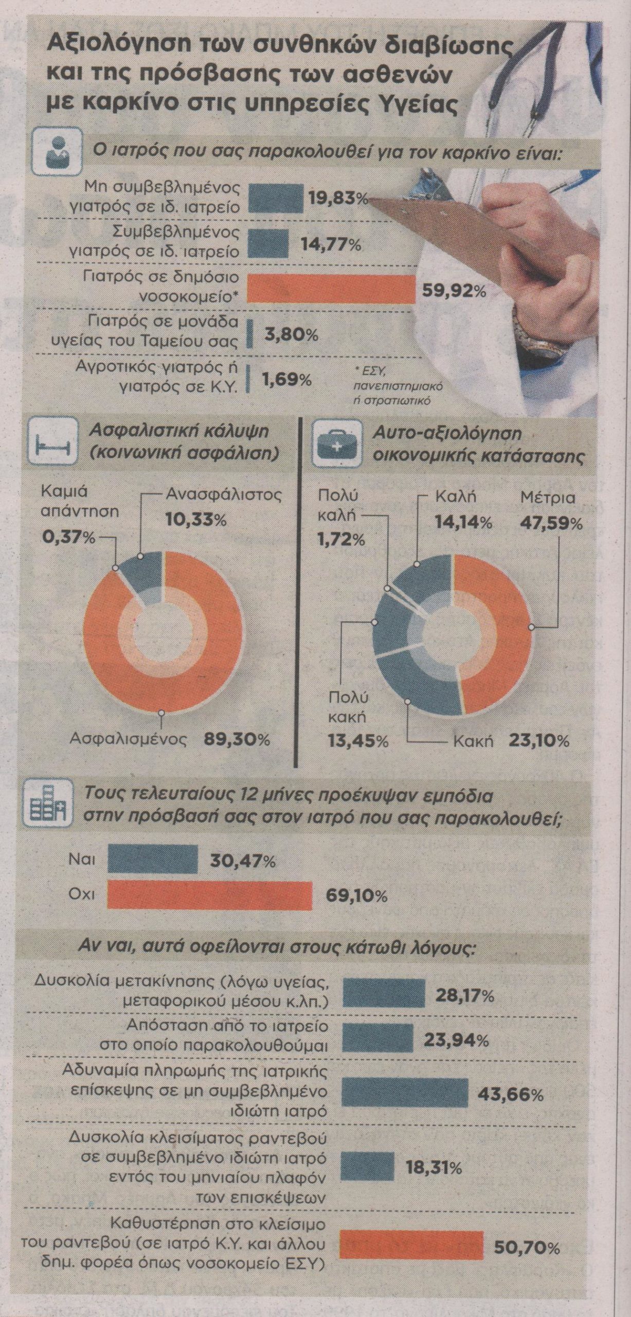 Το 30,5% των ερωτηθέντων ασθενών με καρκίνο δηλώνει ότι αντιμετωπίζει εμπόδια στην πρόσβαση σε γιατρό, το 25,4% δηλώνει ότι αντιμετωπίζει εμπόδια στη θεραπεία, ενώ το 68% των ερωτηθέντων δηλώνει ότι έχει περιορίσει δραστικά τις δαπάνες του σε είδη πρώτης ανάγκης για να αντεπεξέλθει στην ασθένεια.