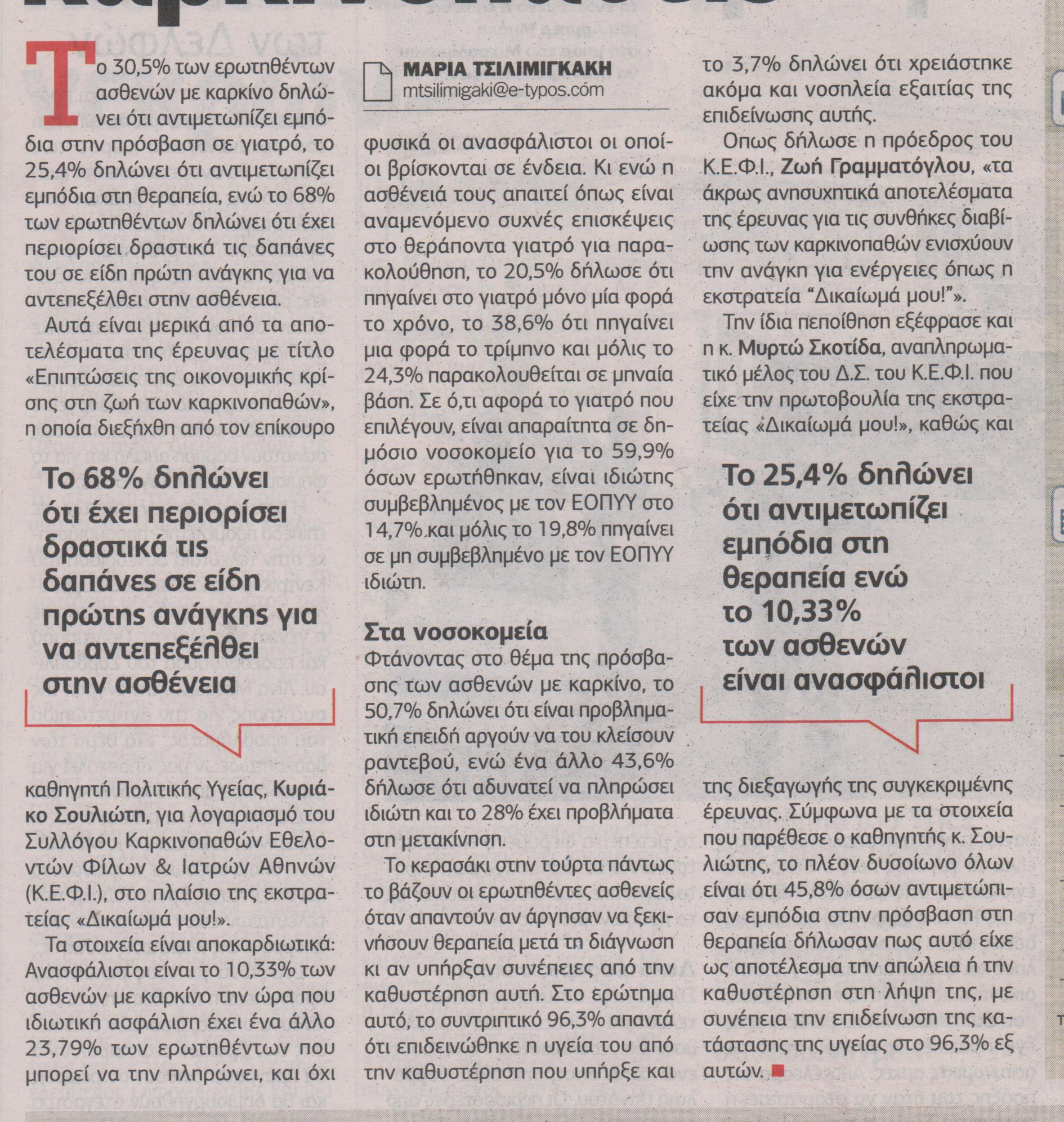 Αυτά είναι μερικά από τα αποτελέσματα της έρευνας με τίτλο “Επιπτώσεις της ��ικονομικής κρίσης στη ζωή των καρκινοπαθών” η οποία διεξήχθη από τον επίκουρο καθηγητή Πολιτικής Υγείας, Κυριάκο Σουλιώτη για λογαριασμό του Συλλόγου Καρκινοπαθών Εθελοντών Φίλων και Ιατρών Αθηνών (Κ.Ε.Φ.Ι) στο πλαίσιο της εκστρατείας “Δικαίωμά μου!”.