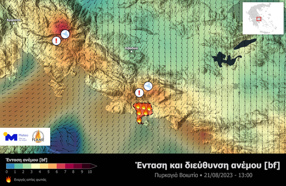 Δυσμενείς θα παραμείνουν οι πυρομετεωρολογικές συνθήκες τις επόμενες ώρες και μέχρι αργά το βράδυ, στις περιοχές των δασικών πυρκαγιών σε Βοιωτία και Έβρο, σύμφωνα με τα νεότερα προγνωστικά δεδομένα πολύ υψηλής ανάλυσης της μονάδας ΜΕΤΕΟ του Εθνικού Αστεροσκοπείου Αθηνών (ΕΑΑ).