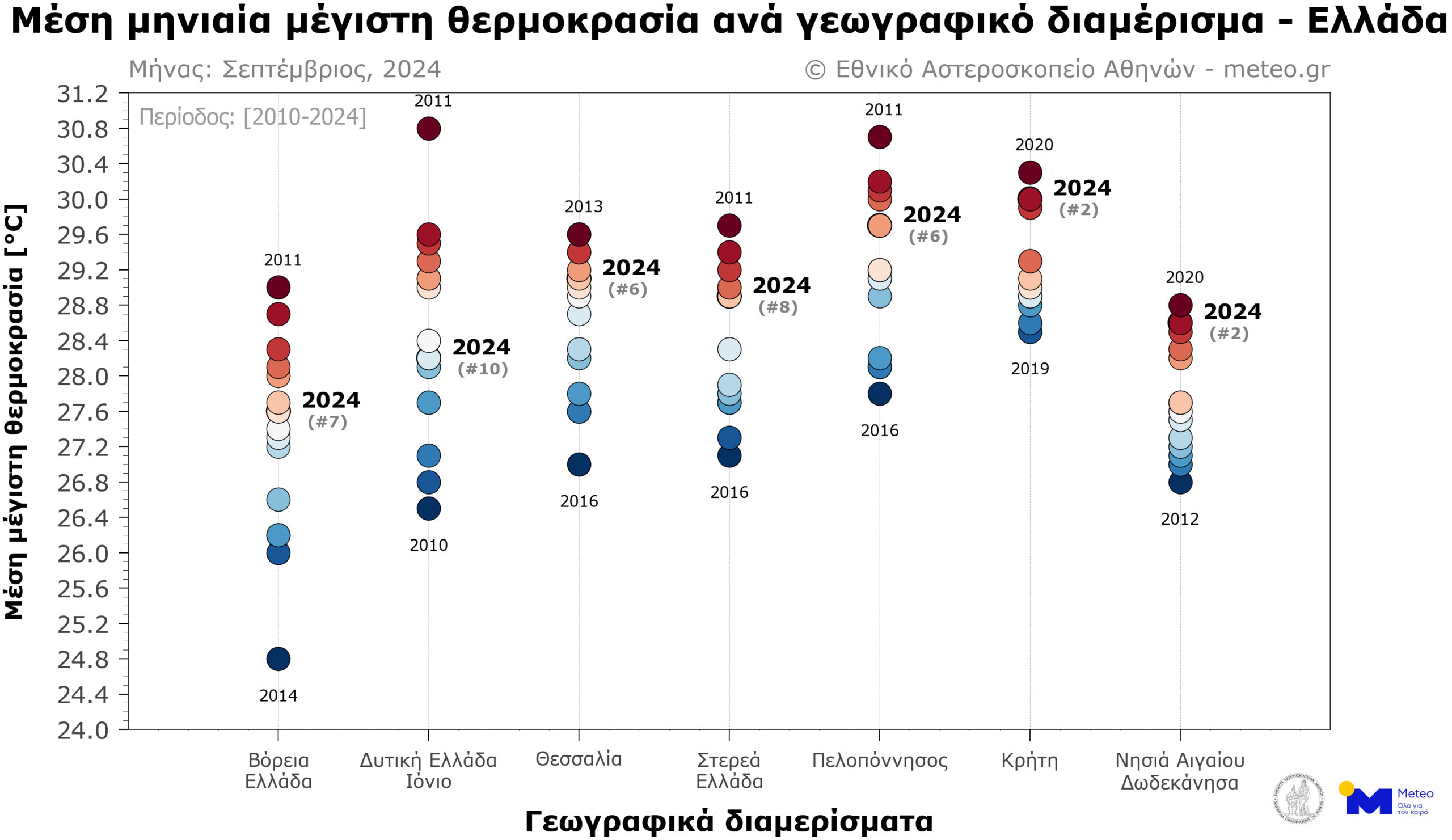 Σε κανονικά για την εποχή επίπεδα κυμάνθηκε η θερμοκρασία τον φετινό Σεπτέμβριο στις περισσότερες περιοχές της χώρας, με εξαίρεση τα νησιά του Αιγαίου και την Κρήτη, όπου ο Σεπτέμβριος του 2024 ήταν ο 2ος θερμότερος από το 2010.