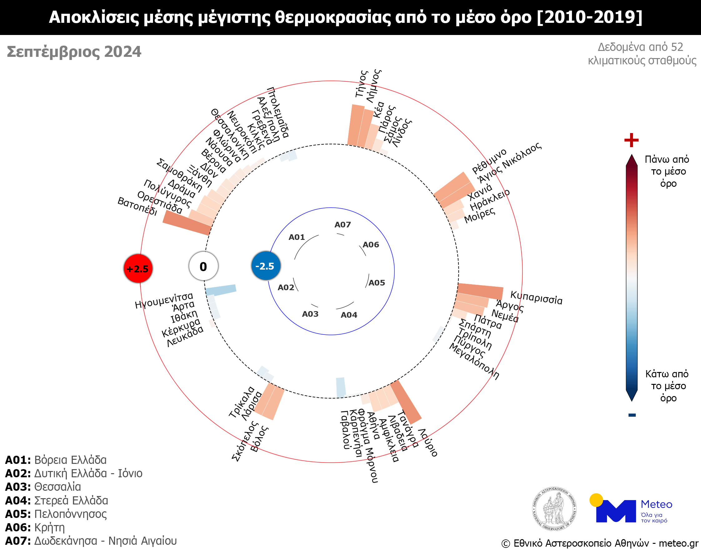 Αναλυτικά, σύμφωνα με το δίκτυο των 53 μετεωρολογικών σταθμών του meteo.gr του Εθνικού Αστεροσκοπείου Αθηνών (Ε.Α.Α) που λειτουργούν ανελλιπώς από το 2010 μέχρι σήμερα, τον φετινό Σεπτέμβριο η μέση τιμή των μεγίστων ημερήσιων θερμοκρασιών κυμάνθηκε σε κανονικά για την εποχή επίπεδα στις περισσότερες περιοχές της χώρας εκτός της Κρήτης και των νησιών του Αιγαίου (σε σχέση με τον μέσο όρο της περιόδου 2010-2019).