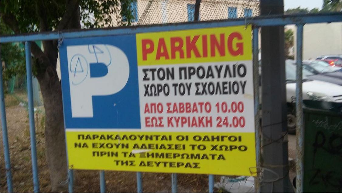 Το «parking» απ’ ότι φαίνεται και στις φωτογραφίες λειτουργεί μόνο Σαββατοκύριακα που το σχολείο παραμένει κλειστό. Μάλιστα, στην πινακίδα αναγράφεται πως οι οδηγοί θα πρέπει να αδειάζουν το χώρο του προαυλίου πριν τα ξημερώματα της Δευτέρας.