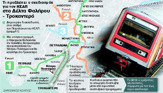 Σύμφωνα με πληροφορίες, στο τραπέζι έχει πέσει η ιδέα στη γραμμή του ΗΣΑΠ –που εκτείνεται από την Κηφισιά έως τον Πειραιά- και ονομάζεται και «Μετρό Γραμμή 1» να δημιουργηθεί μια υπόγεια διακλαδώσεων στον σταθμό των Πετραλώνων, με στόχο ο Ηλεκτρικός να διασχίζει την Καλλιθέα, να προσεγγίζει τις εγκαταστάσεις του Κέντρου Πολιτισμού όπου θα εγκατασταθούν η Εθνική Λυρική Σκηνή και η Εθνική Βιβλιοθήκη και να καταλήγει στο Τροκαντερό. Έτσι για ένα κομμάτι από τα Πετράλωνα μέχρι το Δέλτα Φαλήρου ο Ηλεκτρικός στην πράξη, λόγω της υπόγειας διαδρομής, μετατρέπεται σε μετρό.