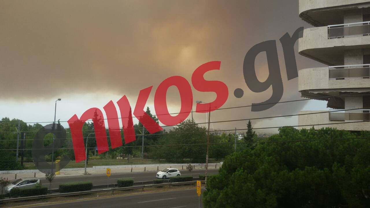 Οι ισχυροί άνεμοι που πνέουν στην περιοχή δυσχεραίνουν την κατάσταση, ενώ μαύρος καπνός έχει σκεπάσει και τον Αττικό Ουρανό.