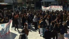 Φοιτητές και μαθητές διαμαρτύρονται κρατώντας πανό και φωνάζοντας συνθήματα.