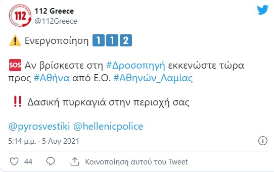 Το μήνυμα αναφέρει: «Αν βρίσκεστε στη Δροσοπηγή εκκενώστε τώρα προς Αθήνα από Ε.Ο. Αθηνών- Λαμίας. Δασική πυρκαγιά στην περιοχή σας».