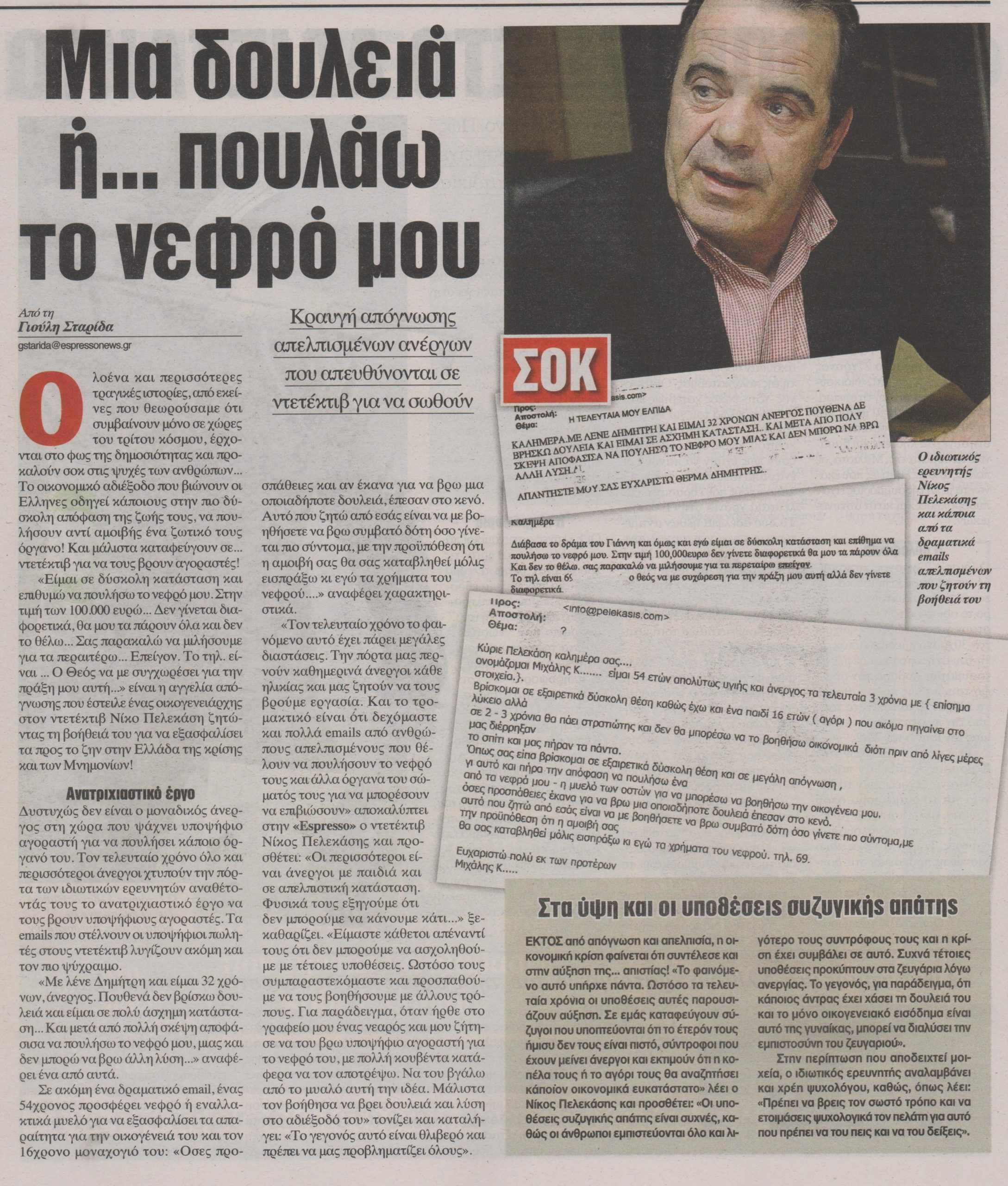 «Είμαι σε δύσκολη κατάσταση και επιθυμώ να πουλήσω το νεφρό μου. Στην τιμή των 100.000 ευρώ… Δεν γίνεται διαφορετικά, θα μου τα πάρουν όλα και δεν το θέλω… Σας παρακαλώ να μιλήσουμε για τα περαιτέρω… Επείγον. Το τηλ είναι… Ο Θεός να με συγχωρέσει για την πράξη μου αυτή…» είναι η αγγελία απόγνωσης που έστειλε ένας οικογενειάρχης στον ντετέκτιβ Νίκο Πελεκάση ζητώντας τη βοήθειά του για να εξασφαλίσει τα προς το ζην στην Ελλάδα της κρίσης και των μνημονίων.