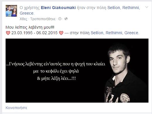 Η αδερφή του Βαγγέλη Γιακουμάκη, Ελένη, έγραψε στο προσωπικό της προφίλ στο facebook “Μου λείπεις λεβέντη μου” και πόσταρε μία φωτογραφία του με μια συγκινητική μαντινάδα.