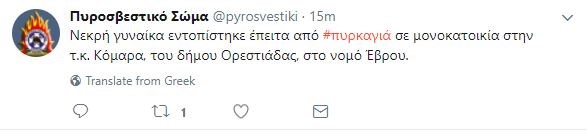 Νεκρή εντοπίστηκε από πυροσβέστες μία ηλικιωμένη έπειτα από πυρκαγιά σε μονοκατοικία στον οικισμό Κόμαρα του δήμου Ορεστιάδας.