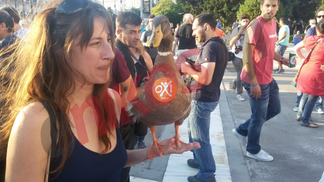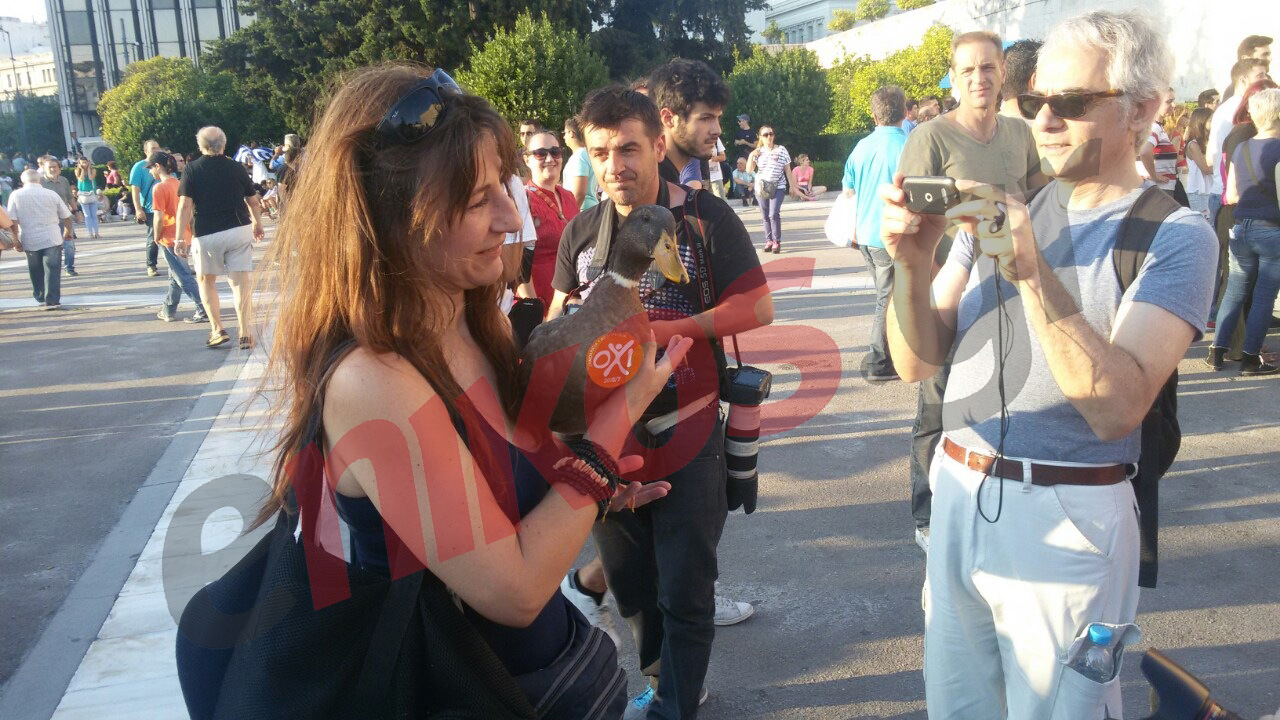 Μία… πάπια έκανε την εμφάνισή της στο Σύνταγμα όπου βρίσκεται σε εξέλιξη η συγκέντρωση υπέρ του «όχι» στο δημοψήφισμα της Κυριακής.