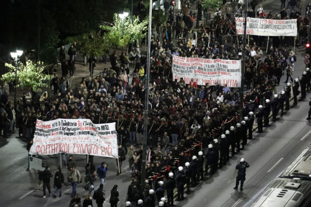 Λίγα λεπτά μετά τις 5 το απόγευμα της Δευτέρας ξεκίνησε η μεγάλη πορεία των οργανώσεων της νεολαίας, των κομμάτων και των συλλογικοτήτων από την πλατεία Κλαυθμώνος προς την αμερικανική πρεσβεία για την επέτειο της εξέγερσης του Πολυτεχνείου.