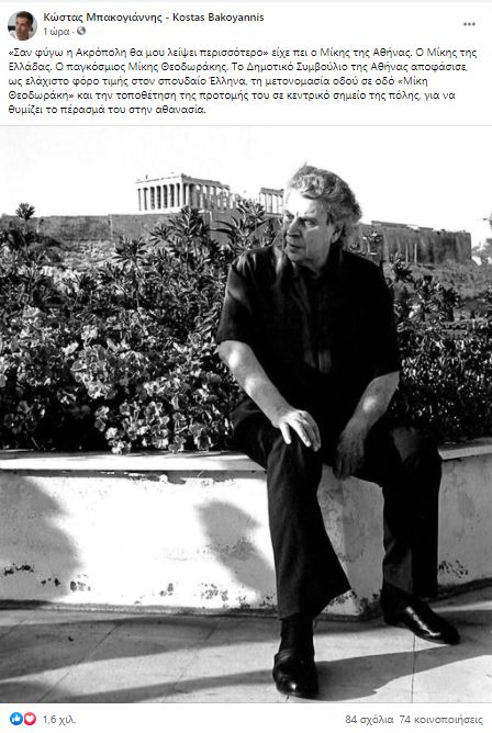 «Σαν φύγω η Ακρόπολη θα μου λείψει περισσότερο” είχε πει ο Μίκης της Αθήνας. Ο Μίκης της Ελλάδας. Ο παγκόσμιος Μίκης Θεοδωράκης. Το Δημοτικό Συμβούλιο της Αθήνας αποφάσισε, ως ελάχιστο φόρο τιμής στον σπουδαίο Έλληνα, τη μετονομασία οδού σε οδό “Μίκη Θεοδωράκη” και την τοποθέτηση της προτομής του σε κεντρικό σημείο της πόλης, για να θυμίζει το πέρασμά του στην αθανασία», ανέφερε ταυτόχρονα σε ανάρτησή του στο προφίλ του στο Facebook o κ. Μπακογιάννης.