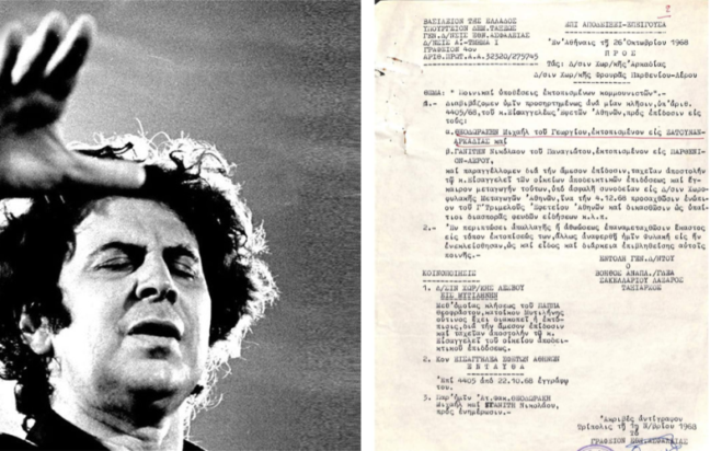 Αυτό είναι το έγγραφο από το υπουργείο Δημόσιας Τάξεως με ημερομηνία 26 Οκτωβρίου 1968. Στο θέμα γράφει “Ποινικαί υποθέσεις εκτοπισμένων κομμουνιστών”. Οι παραλήπτες είναι ο Μίκης Θεοδωράκης (Μιχαήλ το βαπτιστικό του όνομα) και ο Νικόλαος Γανίτης.