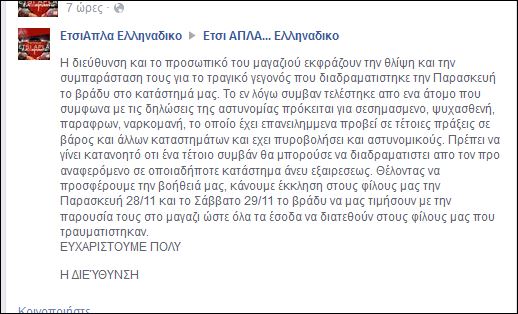 «Η διεύθυνση και το προσωπικό του μαγαζιού εκφράζουν την θλίψη και την συμπαράσταση τους για το τραγικό γεγονός που διαδραματίστηκε την Παρασκευή το βράδυ στο κατάστημά μας. Το εν λόγω συμβάν τελέστηκε από ένα άτομο που σύμφωνα με τις δηλώσεις της αστυνομίας πρόκειται για σεσημασμένο, ψυχασθενή, παράφρων, ναρκομανή, το οποίο έχει επανειλημμένα προβεί σε τέτοιες πράξεις σε βάρος και άλλων καταστημάτων και έχει πυροβολήσει και αστυνομικούς. Πρέπει να γίνει κατανοητό ότι ένα τέτοιο συμβάν θα μπορούσε να διαδραματιστεί από τον προ αναφερόμενο σε οποιαδήποτε κατάστημα άνευ εξαιρέσεως. Θέλοντας να προσφέρουμε την βοήθειά μας, κάνουμε έκκληση στους φίλους μας την Παρασκευή 28/11 και το Σάββατο 29/11 το βράδυ να μας τιμήσουν με την παρουσία τους στο μαγαζί ώστε όλα τα έσοδα να διατεθούν στους φίλους μας που τραυματίστηκαν.