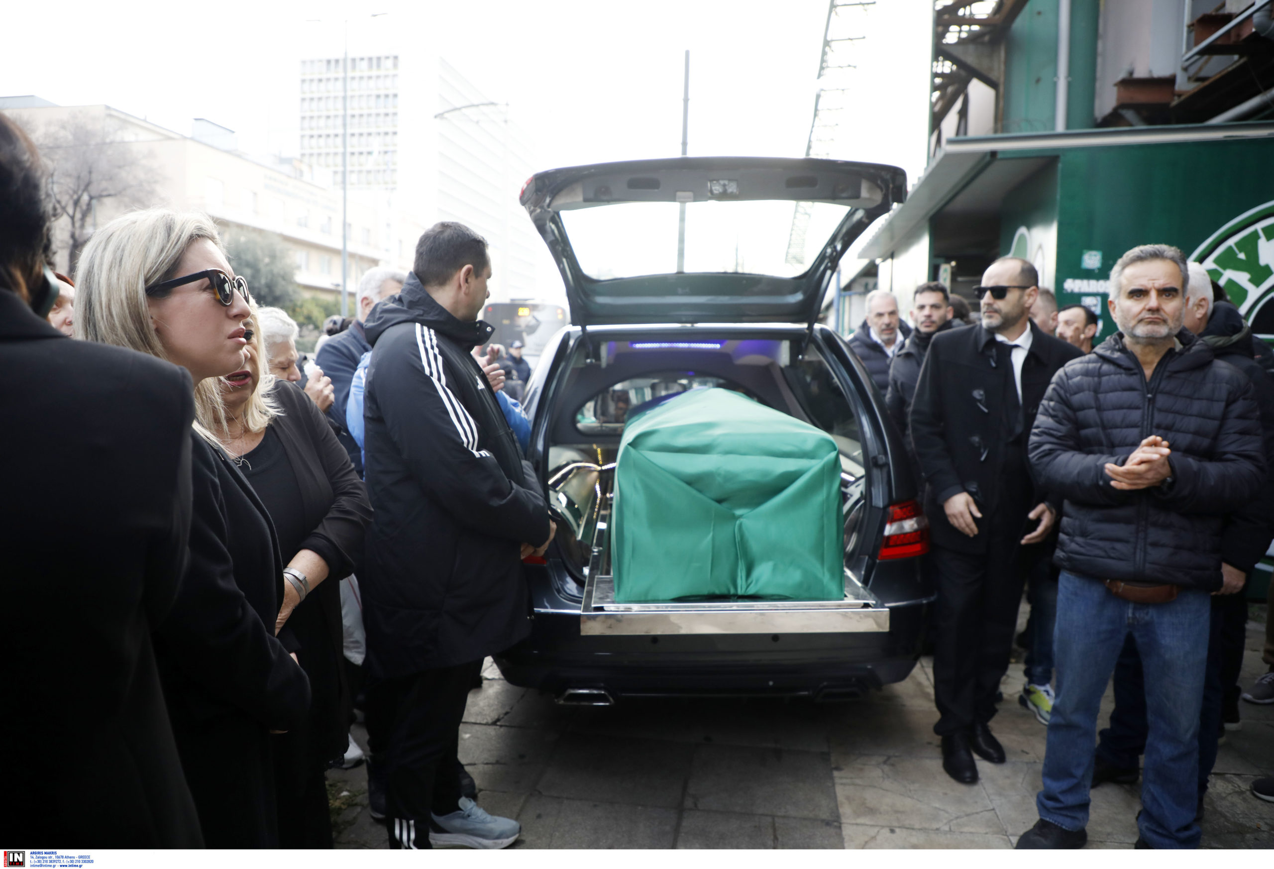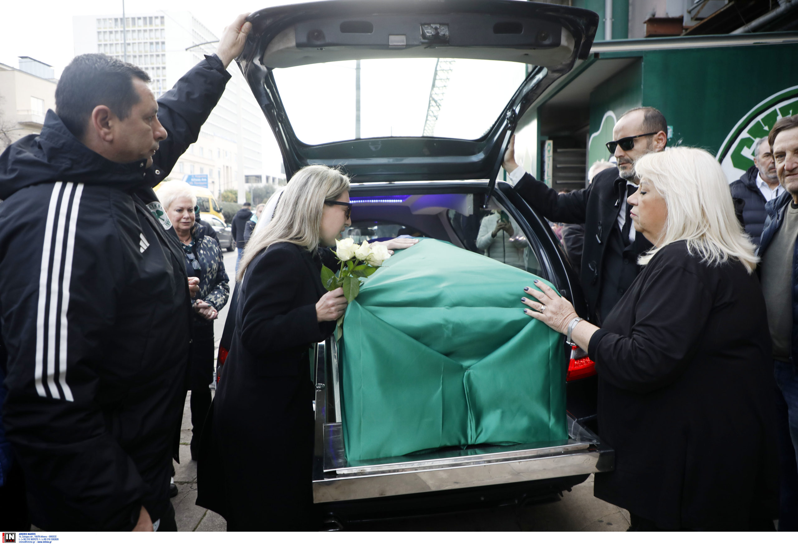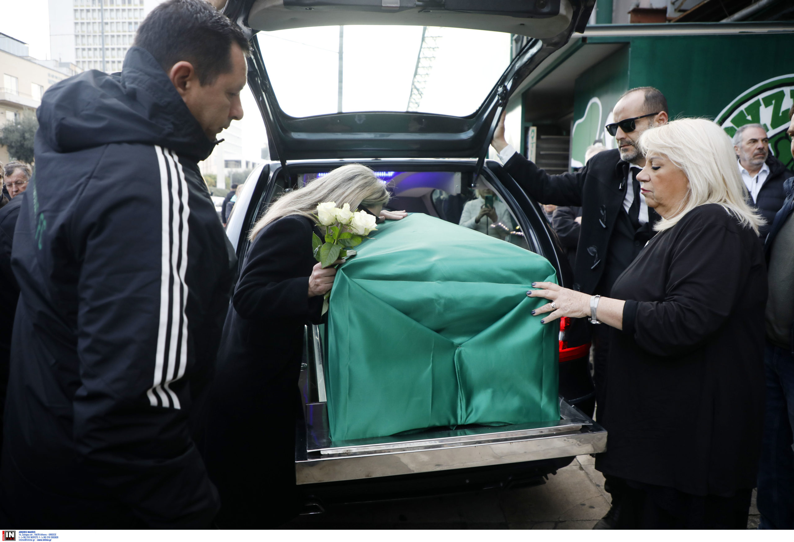 Μόλις το φέρετρο έφτασε έξω από το γήπεδο, η Πόπη Δομάζου γονάτισε και το φίλησε «αποχαιρετώντας» με τον δικό της τρόπο τον πατέρα της, ενώ στα χέρια της κρατούσε λευκά τριαντάφυλλα.