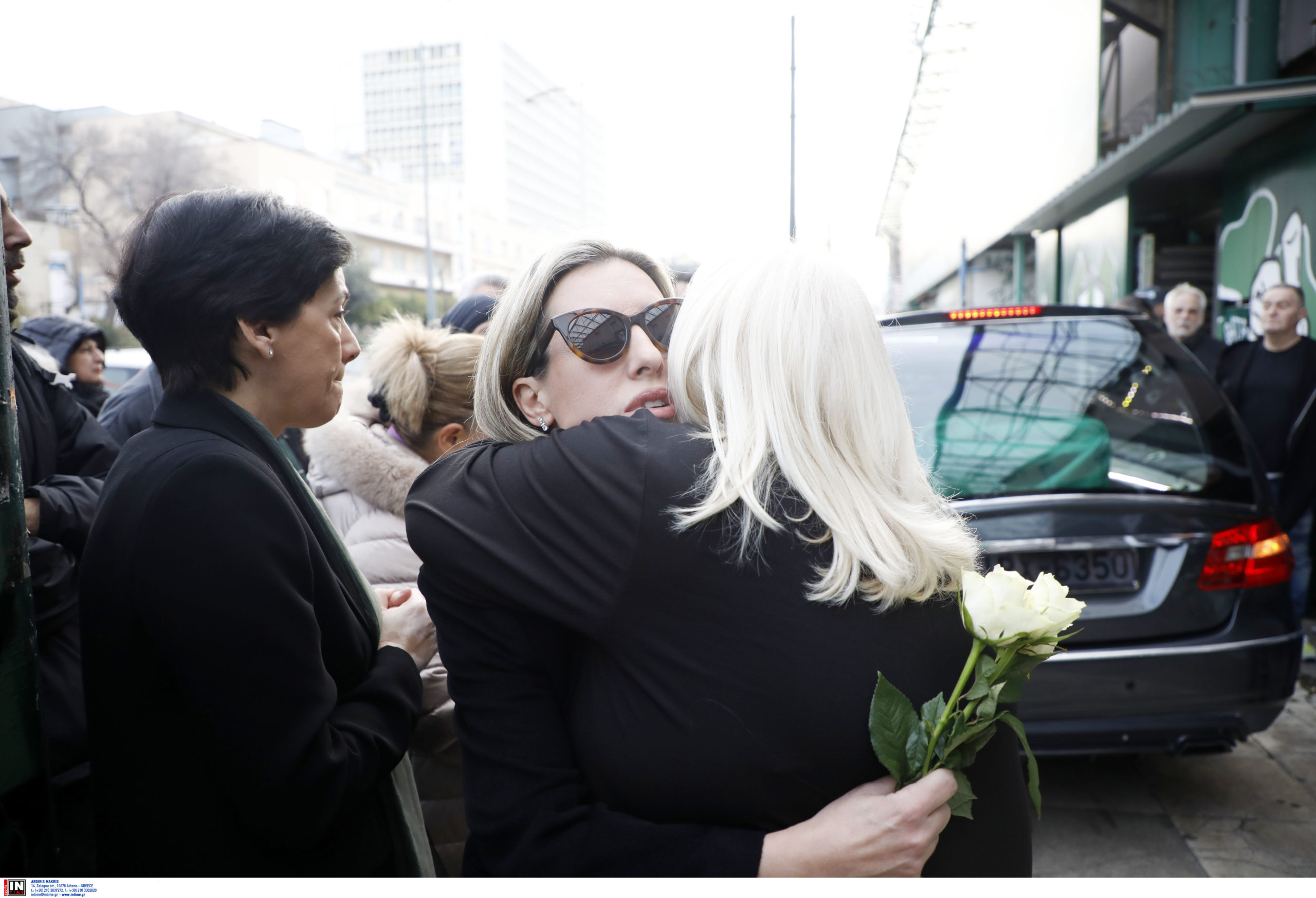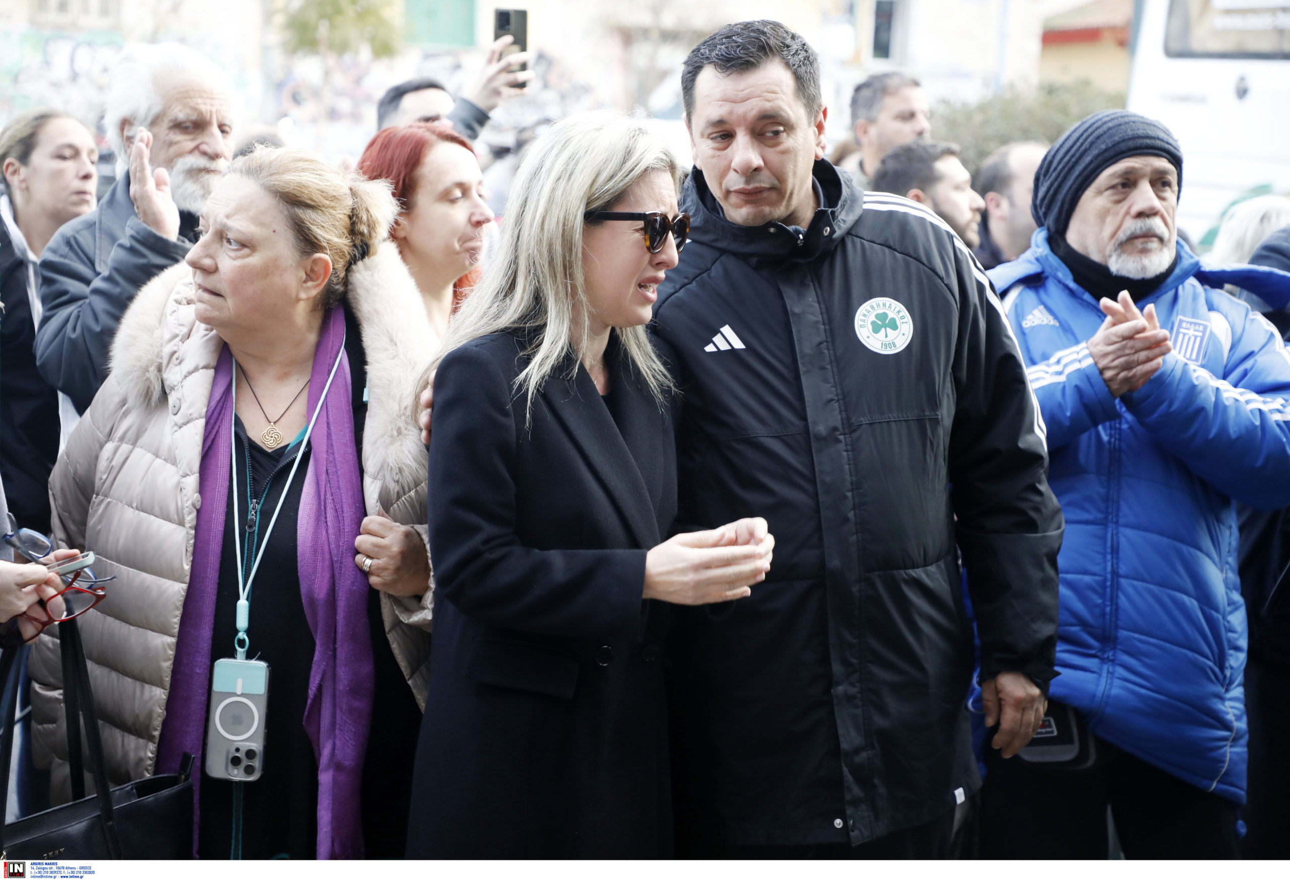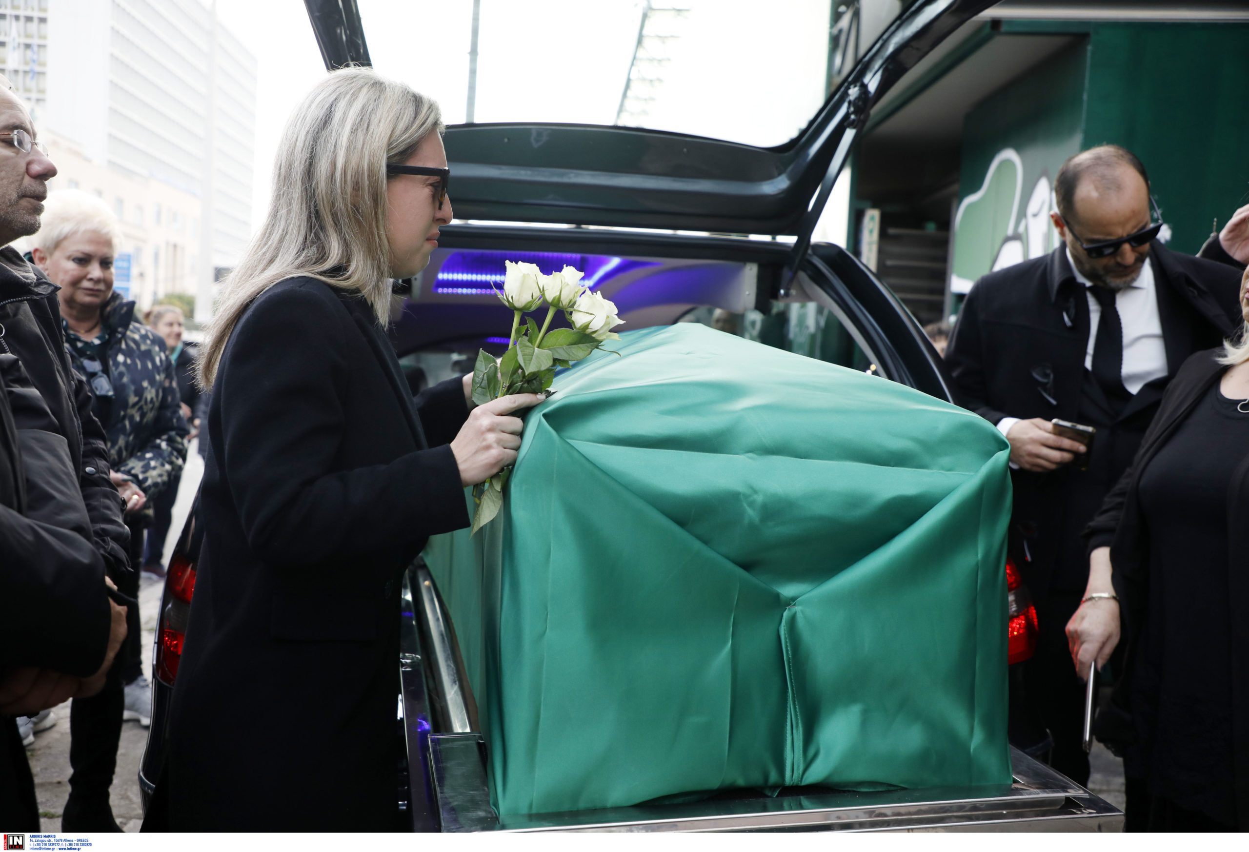 Μόλις το φέρετρο έφτασε έξω από το γήπεδο, η Πόπη Δομάζου γονάτισε και το φίλησε «αποχαιρετώντας» με τον δικό της τρόπο τον πατέρα της, ενώ στα χέρια της κρατούσε λευκά τριαντάφυλλα.