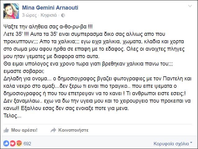 «Ψάξτε την αλήθειας σας α-θό-ρυ-βα! Λετε 35′ !!! Αυτά τα 35′ είναι συμπέρασμα δικό σας αλλιώς από πού προκύπτουν;;; Από τα χαλίκια;;; εγώ είχα χαλίκια, χώματα, κλαδιά και χόρτα στο σώμα μου, αφού ήρθα σε επαφή με το έδαφος. Όλες οι ανοιχτές πληγές μου ήταν γεμάτες με διάφορα από αυτά. Θα είμαι υπόλογος ένα χρόνο τώρα γιατί βρέθηκαν χαλίκια πάνω του;;; είμαστε σοβαροί; Δηλαδή για όνομα… ο δημοσιογράφος βγάζει φωτογραφίες με τον Παντελή και καλά νεκρό στο αμάξι… δεν ξέρω τι είναι πιο τραγικό.. που είπε ψέματα ο δημοσιογράφος ή που του επέτρεψαν να το κάνει ! Τι άνθρωποι είστε εσείς;! Δεν ξαναμιλάω.. έχω να δω την υγεία μου και το χειρουργείο που πρόκειται να κάνω!! Εξάλλου εσάς δεν σας ένοιαξε ποτέ για μένα. Τέλος…», έγραψε χαρακτηριστικά η 32χρονη κοπέλα.