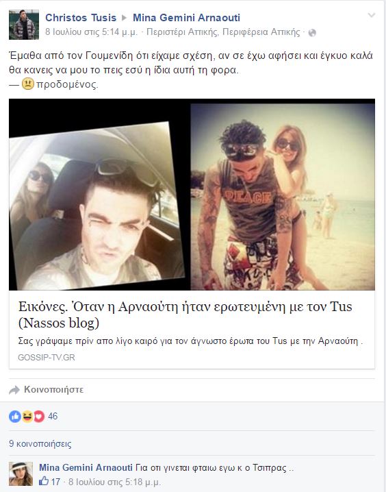 Ο Τus είχε ανεβάσει στη σελίδα της, ένα δημοσιεύμα που ανέφερε ότι οι δύο τους είχαν ερωτική σχέση. «Έμαθα από τον Γουμενίδη ότι είχαμε σχέση. Αν σε έχω αφήσει και έγκυο καλά θα κάνεις να μου το πεις εσύ η ίδια αυτή τη φορα», της έγραψε ο Tus με χιουμοριστική διάθεση.