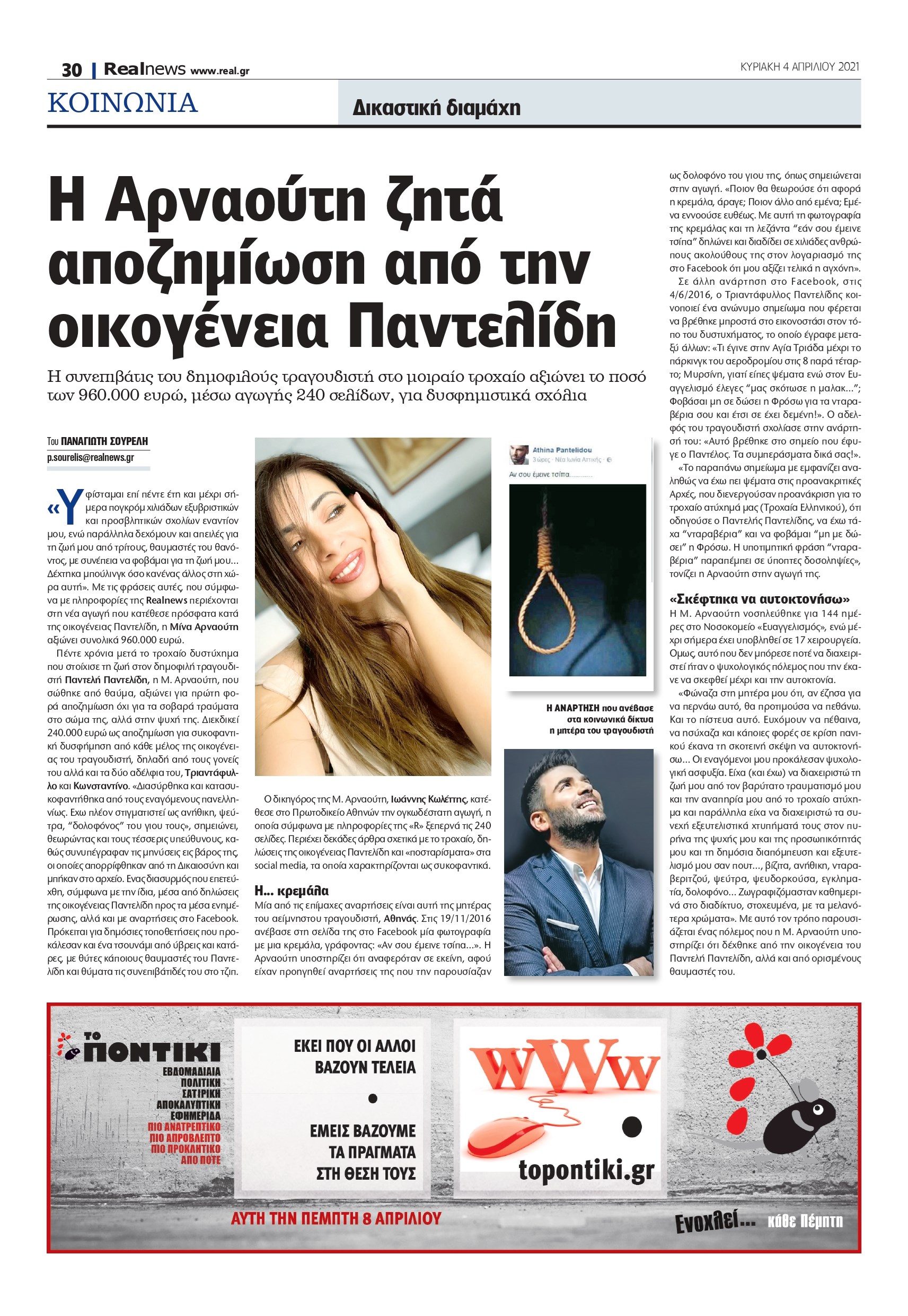 Πέντε χρόνια μετά το τροχαίο δυστύχημα που στοίχισε τη ζωή στον δημοφιλή τραγουδιστή Παντελή Παντελίδη, η Μ. Αρναούτη, που σώθηκε από θαύμα, αξιώνει για πρώτη φορά αποζημίωση όχι για τα σοβαρά τραύματα στο σώμα της, αλλά στην ψυχή της. Διεκδικεί 240.000 ευρώ ως αποζημίωση για συκοφαντική δυσφήμηση από κάθε μέλος της οικογένειας του τραγουδιστή, δηλαδή από τους γονείς του αλλά και τα δύο αδέλφια του, Τριαντάφυλλο και Κωνσταντίνο. “Διασύρθηκα και κατασυκοφαντήθηκα από τους εναγόμενους πανελληνίως. Έχω πλέον στιγματιστεί ως ανήθικη, ψεύτρα, ‘δολοφόνος’ του γιου τους”, σημειώνει, θεωρώντας και τους τέσσερις υπεύθυνους, καθώς συνυπέγραφαν τις μηνύσεις εις βάρος της, οι οποίες απορρίφθηκαν από τη Δικαιοσύνη και μπήκαν στο αρχείο. Ένας διασυρμός που επετεύχθη, σύμφωνα με την ίδια, μέσα από δηλώσεις της οικογένειας Παντελίδη προς τα μέσα ενημέρωσης, αλλά και με αναρτήσεις στο Facebook. Πρόκειται για δημόσιες τοποθετήσεις που προκάλεσαν και ένα τσουνάμι από ύβρεις και κατάρες, με θύτες κάποιους θαυμαστές του Παντελίδη και θύματα τις συνεπιβάτιδές του στο τζιπ. Η συνεπιβάτις του δημοφιλούς τραγουδιστή στο μοιραίο τροχαίο αξιώνει το ποσό των 960.000 ευρώ, μέσω αγωγής 240 σελίδων, για δυσφημιστικά σχόλια.