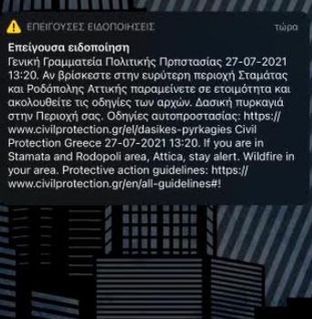 Μήνυμα μέσω του 112 έστειλε η γενική γραμματεία Πολιτικής Προστασίας για τη μεγάλη φωτιά που βρίσκεται σε εξέλιξη στη Σταμάτα. “Αν βρίσκεστε στην ευρύτερη περιοχή Σταμάτας και Ροδόπολης Αττικής παραμείνετε σε ετοιμότητα και ακολουθείτε τις οδηγίες των Αρχών” αναφέρει η επείγουσα ειδοποίηση από το 112.
