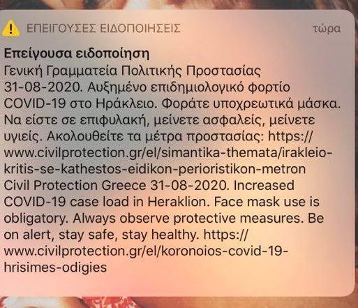 Στο μήνυμα που έλαβαν οι πολίτες από το 112, τονίζεται ότι το επιδημιολογικό φορτίο COVID-19 στο Ηράκλειο είναι αυξημένο και τους καλεί να ακολουθήσουν τα μέτρα, να είναι σε επιφυλακή, να μείνουν ασφαλείς και να μείνουν υγιείς. Το ίδιο μήνυμα ήταν γραμμένο και στην Αγγλική γλώσσα.