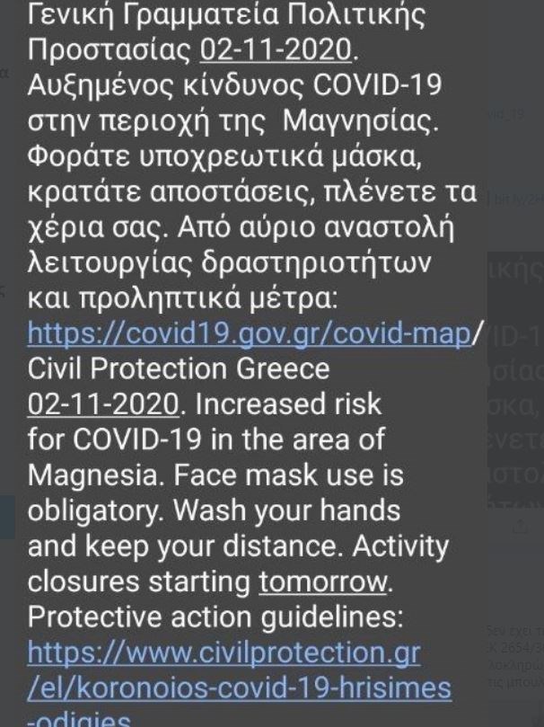 “Φοράτε υποχρεωτικά μάσκα, κρατάτε αποστάσεις, πλένετε τα χέρια σας. Από αύριο αναστολή λειτουργίας δραστηριοτήτων και προληπτικά μέτρα”, αναφέρεται στο μήνυμα.