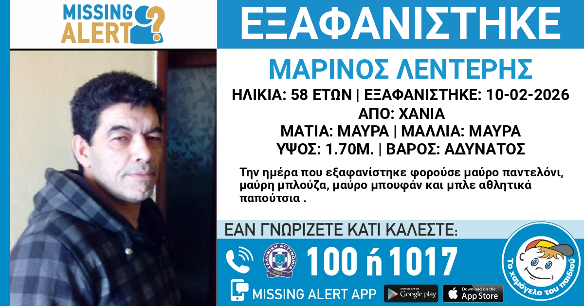 Missing alert εκδόθηκε για την εξαφάνιση ενός 58χρονου από την περιοχή των Χανίων.