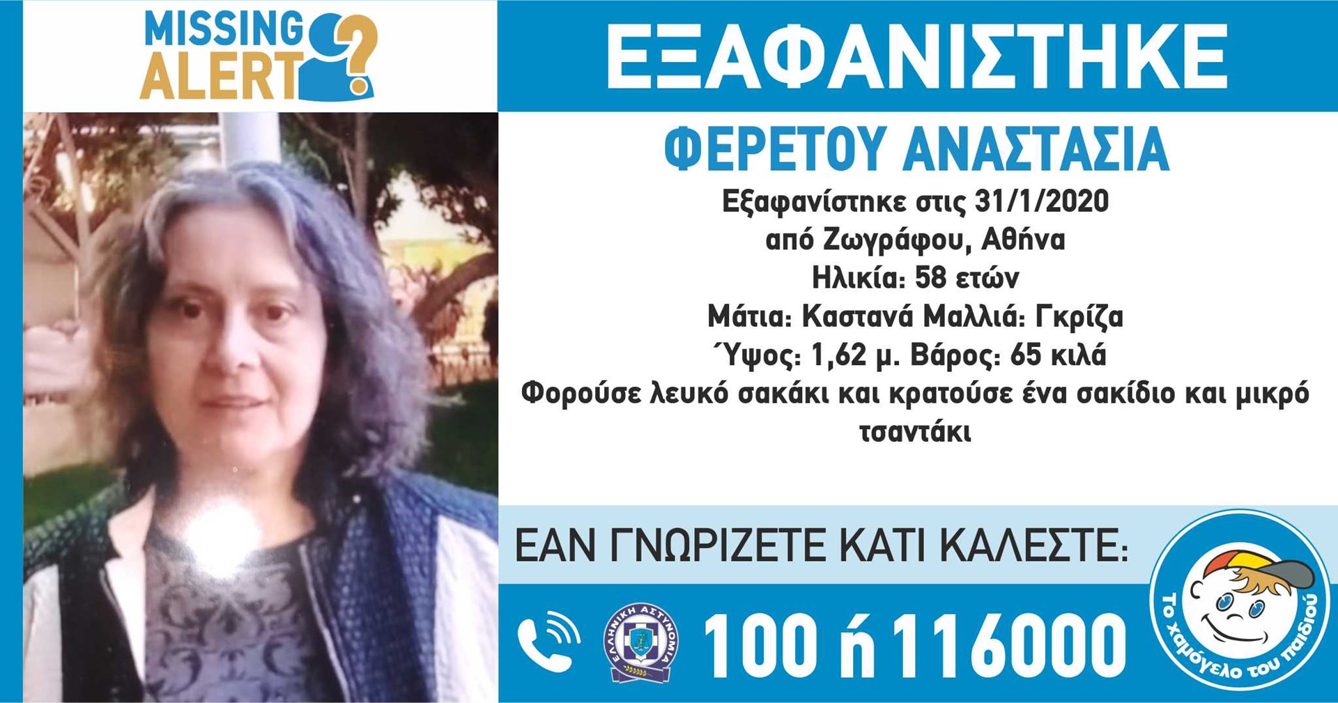 “Στις 31/1/2020, κατά τις βραδινές ώρες, εξαφανίστηκε από την περιοχή του Ζωγράφου, η Αναστασία Φερέτου, 58 ετών. Το «Χαμόγελο του Παιδιού» ενημερώθηκε για την εξαφάνιση της Φερέτου Αναστασίας στις 5/2/2020 και προχώρησε σήμερα στην δημοσιοποίηση των στοιχείων της ενήλικης κατόπιν αιτήματος των συγγενών της καθώς ενδέχεται να συντρέχουν λόγοι οι οποίοι θέτουν τη ζωή της σε κίνδυνο. Η Αναστασία Φερέτου έχει ύψος 1.62 μ., έχει κανονικό βάρος, έχει γκρίζα μαλλιά και καστανά μάτια. Φορούσε λευκό σακάκι και κρατούσε δύο τσάντες.