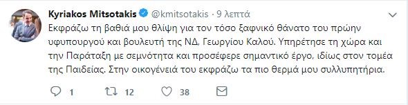 Τη βαθιά θλίψη του για τον ξαφνικό θάνατο του πρώην υφυπουργού και βουλευτή της ΝΔ, Γιώργου Καλού εξέφρασε ο πρόεδρος τoυ κόμματος Κυριάκος Μητσοτάκης σε ανάρτησή του στο twitter.