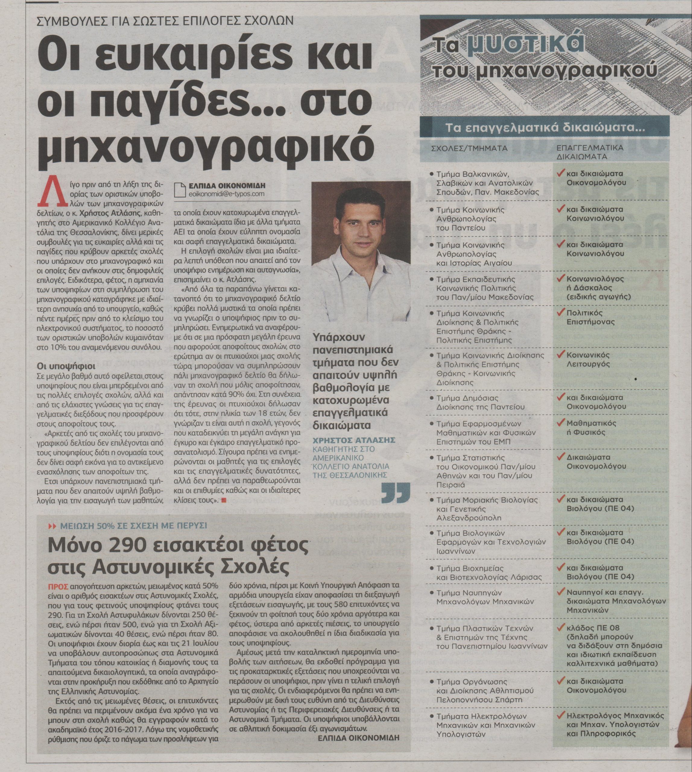 Λίγο πριν από τη λήξη της διορίας των οριστικών υποβολών των μηχανογραφικών δελτίων, ο Χρήστος Ατλάσης, καθηγητής στο Αμερικανικό Κολλέγιο Ανατόλια της Θεσσαλονίκης, δίνει μερικές συμβουλές για τις ευκαιρίες, αλλά και τις παγίδες που κρύβουν αρκετές σχολές που υπάρχουν στο μηχανογραφικό και οι οποίες δεν ανήκουν στις δημοφιλείς επιλογές.