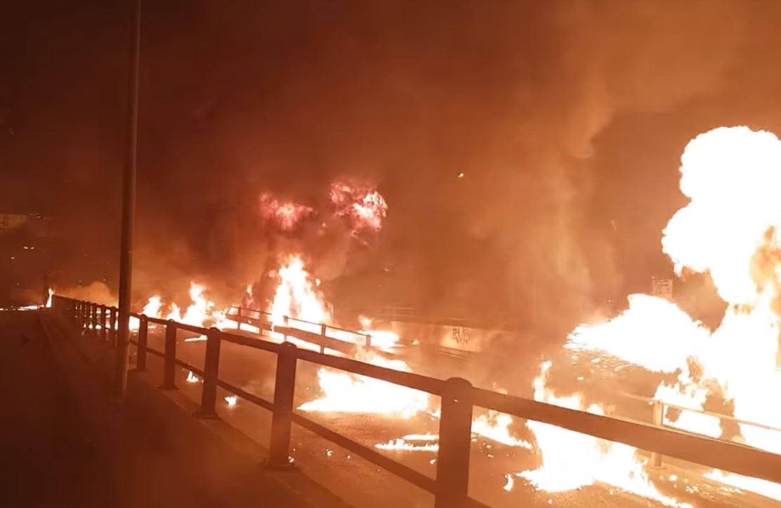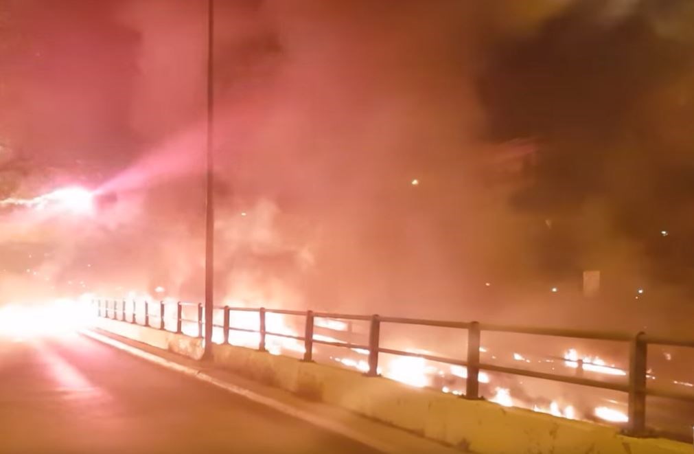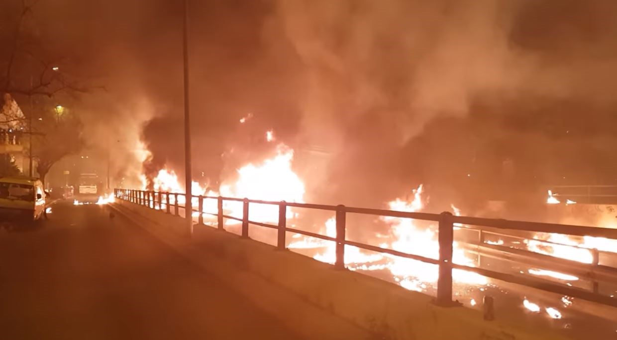 Μόλις ακουστεί το Χριστός Ανέστη, τα βεγγαλικά και οι μολότοφ πέφτουν βροχή στον κεντρικό δρόμο έξω από τον Ιερό Ναό της Αναλήψεως, μετατρέποντας τη νύχτα σε μέρα.