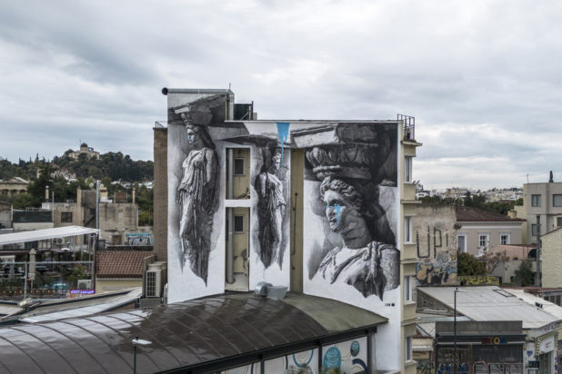 Φωτογραφία που δόθηκε στη δημοσιότητα το Σάββατο 27 Ιανουαρίου 2024 και εικονίζει την τοιχογραφία μεγάλης κλίμακας «Καρυάτιδες που κλαίνε» του Έλληνα καλλιτέχνη ΙΝΟ στο Μοναστηράκι, Πέμπτη 21 Δεκεμβρίου 2023. Με την υποστήριξη του Δήμου Αθηνών, ο Έλληνας καλλιτέχνης ΙΝΟ δημιούργησε μια τοιχογραφία μεγάλης κλίμακας στο Μοναστηράκι, σε κτίριο επί της οδού Ερμού 121. Το έργο απεικονίζει 3 ασπρόμαυρες Καρυάτιδες οι οποίες κοιτάνε προς διαφορετικές κατευθύνσεις και γαλάζια δάκρυα τρέχουν από τα μάτια τους. Η αριστερή βλέπει προς την Ακρόπολη νοσταλγώντας την επιστροφή της στον τόπο για τον οποίο δημιουργήθηκε και απεικονίζει το άγαλμα που βρίσκεται στο Βρετανικό μουσείο. Η μεσαία δείχνει το άγαλμα που βρίσκεται στη γωνία στο Ερέχθειο και βλέπει την κοινωνία στις μέρες μας. Η δεξιά κοιτάει προς τη Βουλή θλιμμένη από τους πολιτικούς χειρισμούς που έφεραν τη χώρα σε άσχημη θέση. ΑΠΕ-ΜΠΕ/ΠΡΟΣΩΠΙΚΟ ΑΡΧΕΙΟ ΙΝΟ/ΙΝΟ