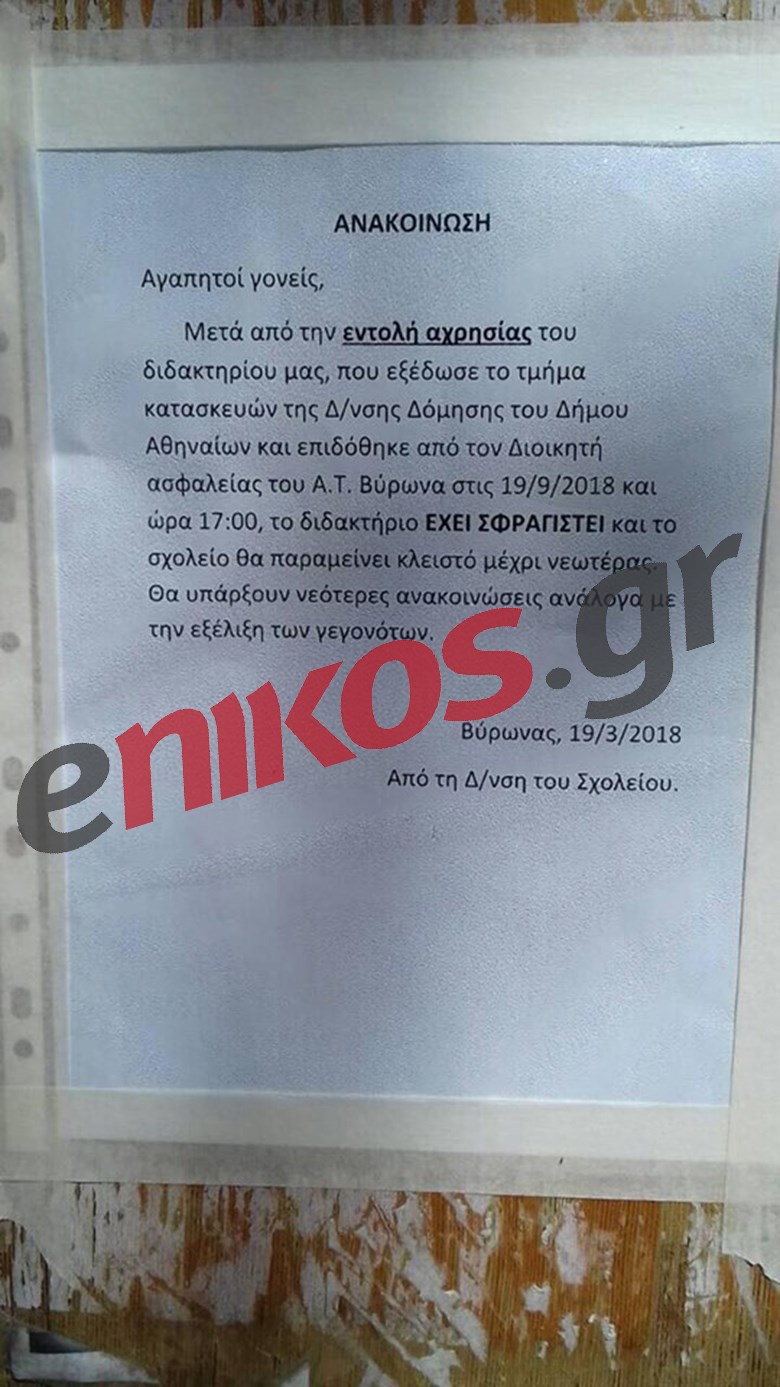 Οι γονείς πήγαν εκ νέου στον Δήμαρχο Βύρωνα προκειμένου να βρεθεί άμεσα λύση, ο οποίος αποφάσισε να βάλει “λουκέτο” στο σχολείο… “μέχρι νεοτέρας”, όπως αναφέρεται στην ανακοίνωση που εξέδωσε.