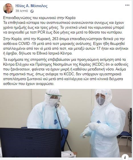 Όπως επισημαίνει μεταξύ άλλων ο κ. Μόσιαλος “τα ευρήματα της επιτροπής επιβεβαίωσαν μια προηγούμενη εκτίμηση από τα Κέντρα Ελέγχου και Πρόληψης Νοσημάτων της Κορέας (KCDC) ότι οι ασθενείς που ξανανοσούν, φαίνεται να έχουν μικρή ή καθόλου μεταδοτική νόσο”.