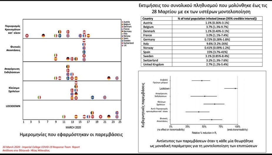 Σε ανάρτησή του στο Facebook, ο εκπρόσωπος της Ελλάδας στους διεθνείς Οργανισμούς για τον κορονοϊό, Ηλίας Μόσιαλος κάνει λόγο για πλήρη επιβεβαίωση της στρατηγικής που ακολούθησε η Ελλάδα στην αντιμετώπιση της πανδημίας. Ο κ. Μόσιαλος παραθέτει κάποια στοιχεία της έκθεσης του COVID-19 Response Team του Imperial College London σχετικά με τις επιπτώσεις των μη φαρμακευτικών παρεμβάσεων διαφόρων χωρών έναντι της πανδημίας.Ολόκληρη η ανάρτηση του κ. Μόσιαλου αναφέρει τα εξής:”Εκτίμηση του αριθμού των λοιμώξεων και των επιπτώσεων των μη φαρμακευτικών παρεμβάσεων της νόσου COVID-19 σε 11 ευρωπαϊκές χώρες. Πλήρης επιβεβαίωση της στρατηγικής που ακολουθήσαμε στην Ελλάδα. Στις 30 Μαρτίου, το COVID-19 Response Team του Imperial College London, παρουσίασε μια έκθεση αναφορικά με τις επιπτώσεις των μη φαρμακευτικών παρεμβάσεων διαφόρων χωρών, έναντι της πανδημίας. Για τους υπολογισμούς χρησιμοποίησαν ως εργαλείο ένα προγνωστικό μοντέλο για την ερμηνεία του αντίκτυπου (semi-mechanistic Bayesian hierarchical model). Η μέθοδος υπέθετε πως οι αλλαγές στον αριθμό αναπαραγωγής κρουσμάτων (ένα μέτρο αναμετάδοσης) αντικατοπτρίζουν τις εφαρμοζόμενες παρεμβάσεις, και όχι οι ευρύτερες σταδιακές αλλαγές στη συμπεριφορά. Το μοντέλο εκτίμησε αυτές τις μεταβολές υπολογίζοντας το χρόνο αναδρομικά. Δηλαδή πηγαίνοντας προς τα πίσω, υπολόγισαν τους θανάτους που καταγράφηκαν με την πάροδο του χρόνου για να εκτιμήσουν τη μετάδοση που συνέβη αρκετές εβδομάδες πριν, και το μοντέλο συνυπολόγιζε την χρονική καθυστέρηση μεταξύ της αρχικής μόλυνσης από τον ιό και του θανάτου. Μία από τις βασικές παραδοχές του μοντέλου είναι ότι κάθε παρέμβαση έχει το ίδιο αποτέλεσμα στον αριθμό αναπαραγωγής κρουσμάτων και μεταξύ των χωρών αλλά και με την πάροδο του χρόνου. Αυτό τους επέτρεψε να αξιοποιήσουν περισσότερα δεδομένα σε όλη την Ευρώπη ώστε να εκτιμήσουν αυτές τις επιπτώσεις. Αυτό επίσης σημαίνει πως τα αποτελέσματά κατευθύνονταν από τα δεδομένα χωρών με πιο προηγμένες χρονικά επιδημίες και προηγούμενες παρεμβάσεις, όπως η Ιταλία και η Ισπανία. Διαπιστώθηκε πως η επιβράδυνση της αύξησης των καθημερινών θανάτων στην Ιταλία συνδεόταν με τις σημαντικές επιπτώσεις των παρεμβάσεων που εφαρμόστηκαν αρκετές εβδομάδες νωρίτερα. Στην Ιταλία, υπολογίστηκε ότι ο πραγματικός αριθμός αναπαραγωγής (Rt) έπεσε κοντά στο 1 περίπου όταν εφαρμόστηκαν τα καθολικά μέτρα απαγόρευσης (lockdown – 11 Μαρτίου). Να σημειωθεί όμως πως τα αποτελέσματα παρουσιάζουν υψηλό επίπεδο αβεβαιότητας / αποκλίσεων. Συνολικά, η εκτίμηση της έκθεση είναι πως οι χώρες κατάφεραν να μειώσουν τον αριθμό αναπαραγωγής κρουσμάτων. Οι εκτιμήσεις των εμπειρογνωμόνων της ομάδας είχαν ευρεία διαστήματα αξιοπιστίας θέτοντας ‘1’ για τις χώρες που εφάρμοσαν όλες τις παρεμβάσεις που λαμβάνονταν υπόψιν στην ανάλυσή. Αυτό σημαίνει ότι ο αριθμός αναπαραγωγής μπορούσε να είναι μεγαλύτερος ή μικρότερος από την τιμή 1. Δεδομένου ότι οι τρέχουσες παρεμβάσεις παρέμειναν σε ισχύ τουλάχιστον μέχρι το τέλος Μαρτίου, η εκτίμηση της έκθεσης είναι ότι οι παρεμβάσεις στις 11 χώρες απέτρεψαν 59.000 θανάτους μέχρι τις 31 Μαρτίου [και θεωρείται πως το πραγματικό νούμερο κυμαίνεται μεταξύ 21.000-120.000]. Πολλοί περισσότεροι θάνατοι θα αποφευχθούν, συνεχίζει η έκθεση, εξασφαλίζοντας ότι οι παρεμβάσεις θα παραμείνουν σε ισχύ μέχρις ότου η μετάδοση πέσει σε χαμηλά επίπεδα. Εκτιμούν επίσης ότι στις 11 χώρες είχαν 