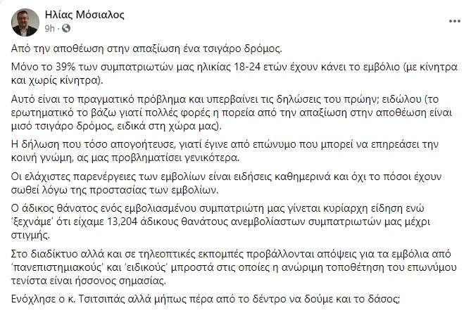 “Οι ελάχιστες παρενέργειες των εμβολίων είναι ειδήσεις καθημερινά και όχι το πόσοι έχουν σωθεί λόγω της προστασίας των εμβολίων. Ο άδικος θάνατος ενός εμβολιασμένου συμπατριώτη μας γίνεται κυρίαρχη είδηση ενώ ‘ξεχνάμε’ ότι είχαμε 13,204 άδικους θανάτους ανεμβολίαστων συμπατριωτών μας μέχρι στιγμής. Στο διαδίκτυο αλλά και σε τηλεοπτικές εκπομπές προβάλλονται απόψεις για τα εμβόλια από ‘πανεπιστημιακούς’ και ‘ειδικούς’ μπροστά στις οποίες η ανώριμη τοποθέτηση του επωνύμου τενίστα είναι ήσσονος σημασίας. Ενόχλησε ο κ. Τσιτσιπάς αλλά μήπως πέρα από το δέντρο να δούμε και το δάσος;” καταλήγει ο κ. Μόσιαλος.