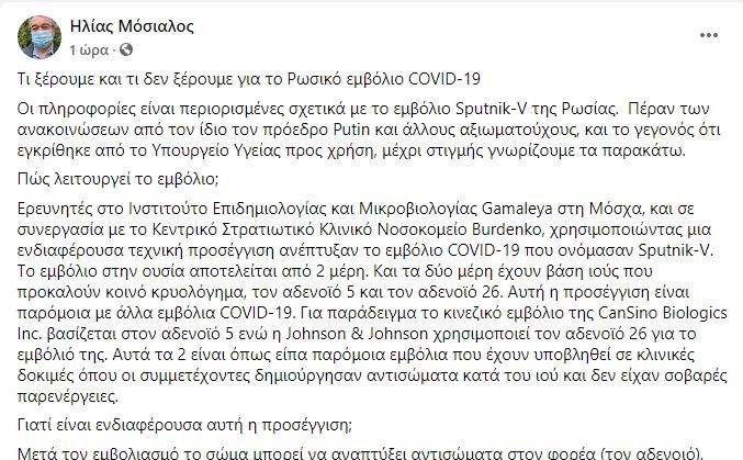 Για το εμβόλιο Sputnik -V της Ρωσίας κατά του κορονοϊού ενημερώνει με ανάρτησή του στο Facebook ο Ηλίας Μόσιαλος. Ο καθηγητής Δημόσιας Υγείας του LSE αποκωδικοποιεί όλες τις πληροφορίες σχετικά με το τι γνωρίζουμε και τι δεν γνωρίζουμε για το ρωσικό εμβόλιο. Όπως αναφέρει μεταξύ άλλων “οι πληροφορίες είναι περιορισμένες σχετικά με το εμβόλιο Sputnik-V της Ρωσίας. Πέραν των ανακοινώσεων από τον ίδιο τον πρόεδρο Putin και άλλους αξιωματούχους, και το γεγονός ότι εγκρίθηκε από το Υπουργείο Υγείας προς χρήση, μέχρι στιγμής γνωρίζουμε τα παρακάτω”