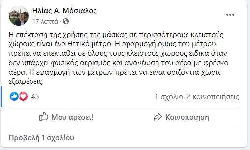 Για την απόφαση υποχρεωτικής χρήσης της μάσκας σε περισσότερους κλειστούς χώρους που ανακοινώθηκε σήμερα, τοποθετήθηκε ο Ηλίας Μόσιαλος. Σε ανάρτησή του στον προσωπικό λογαριασμό του στο Facebook, το χαρακτηρίζει ένα θετικό μέτρο όμως επισημαίνει ότι η εφαρμογή του μέτρου πρέπει να επεκταθεί σε όλους τους κλειστούς χώρους.