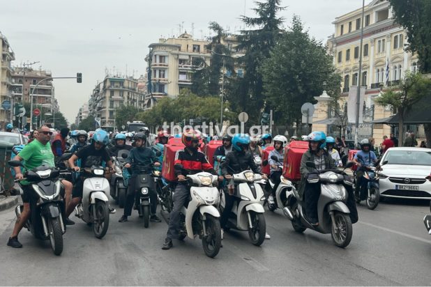 Νέα κοινή μοτοπορεία στους δρόμους της Θεσσαλονίκης πραγματοποιούν αυτή την ώρα διανομείς της E-food και της Wolt, στο πλαίσιο της 24ωρης πανελλαδικής απεργίας που έχουν κηρύξει για σήμερα Παρασκευή (11/10).