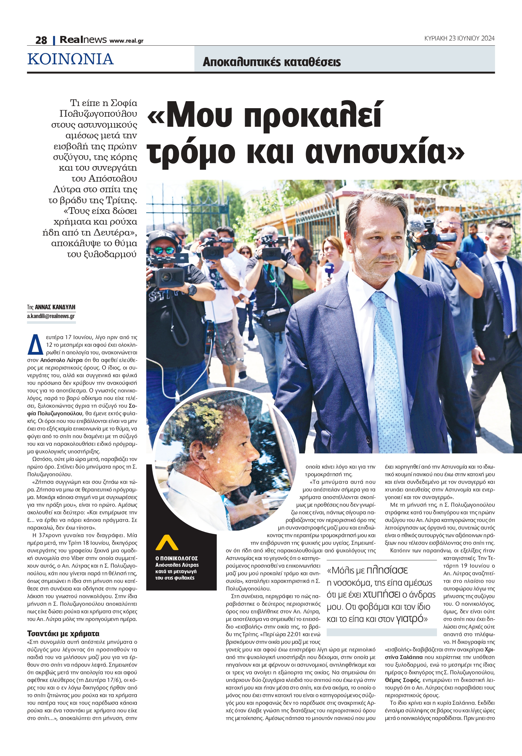 Το προηγούμενο Σαββατοκύριακο δεν κατέρρευσε μόνο η εικόνα της «ευτυχισμένης οικογένειας Λύτρα». Κατέρρευσε και αυτή της οικονομικής ευρωστίας όπως προκύπτει μέσα από τα μηνύματα του συνεργάτη τους, ο οποίος ζητά, με πιεστικό τρόπο, χρήματα προκειμένου να πληρωθούν υποχρεώσεις, αλλά και από την αποκάλυψη ότι ακίνητα του ποινικολόγου βγαίνουν στο «σφυρί» λόγω χρεών. Ολα αυτά δημιουργούν αβεβαιότητα και για το μέλλον του δικηγορικού γραφείου. Ενα γραφείο που χειρίστηκε και χειρίζεται ουκ ολίγες υποθέσεις, με αποτέλεσμα ο Απ. Λύτρας να εμφανίζεται συχνά στα ΜΜΕ. Μεταξύ των υποθέσεων αυτών ήταν και η απόπειρα ανθρωποκτονίας της Ιωάννας Παλιοσπύρου με βιτριόλι και η υπεράσπιση της μητέρας της 12χρονης από τον Κολωνό. Πλέον, ο Απ. Λύτρας από το κελί της ΣΤ’ πτέρυγας του Κορυδαλλού όπου κρατείται δεν θα μπορέσει να συνεχίσει να ασκεί τη δικηγορία. Την ερχόμενη Τετάρτη έχει προσδιοριστεί να ξεκινήσει η δίκη για τη δολοφονία του δημοσιογράφου Γιώργου Καραϊβάζ και ο 52χρονος ποινικολόγος επρόκειτο να παραστεί ως δικηγόρος της χήρας του δημοσιογράφου. Παράλληλα, είχε αναλάβει και την υπεράσπιση του δολοφόνου της Κυριακής Γρίβα έξω από το αστυνομικό τμήμα των Αγίων Αναργύρων, ενώ στο «βιογραφικό» του περιλαμβάνεται και η εκπροσώπηση θυμάτων κακοποίησης. Το 2022 ανέλαβε τη σύντροφο του Θέμη Αδαμαντίδη, η οποία είχε καταγγείλει τον γνωστό τραγουδιστή για ξυλοδαρμό, αλλά και την υποστήριξη της κατηγορίας στην υπόθεση δολοφονίας μιας 54χρονης από τον πρώην σύζυγό της στην Ιεράπετρα.