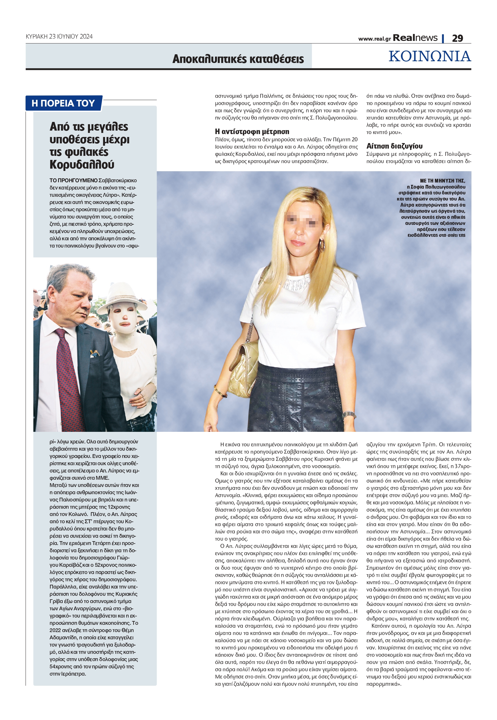 Πλέον, όμως, τίποτα δεν μπορούσε να αλλάξει. Την Πέμπτη 20 Ιουνίου εκτελείται το ένταλμα και ο Απ. Λύτρας οδηγείται στις φυλακές Κορυδαλλού, εκεί που μέχρι πρόσφατα πήγαινε μόνο ως δικηγόρος κρατουμένων που υπερασπιζόταν. Η εικόνα του επιτυχημένου ποινικολόγου με τη χλιδάτη ζωή κατέρρευσε το προηγούμενο Σαββατοκύριακο. Οταν λίγο μετά τη μία τα ξημερώματα Σαββάτου προς Κυριακή φτάνει με τη σύζυγό του, άγρια ξυλοκοπημένη, στο νοσοκομείο. Και οι δύο ισχυρίζονται ότι η γυναίκα έπεσε από τις σκάλες. Ομως ο γιατρός που την εξέτασε καταλαβαίνει αμέσως ότι τα χτυπήματα που έχει δεν συνάδουν με πτώση και ειδοποιεί την Αστυνομία. «Κλινικά, φέρει εκχυμώσεις και οίδημα προσώπου -μέτωπο, ζυγωματικά, αμφώ- εκχυμώσεις οφθαλμικών κογχών, θλαστικό τραύμα δεξιού λοβού, ωτός, οίδημα και αιμορραγία ρινός, εκδορές και οιδήματα άνω και κάτω χείλους. Η γυναίκα φέρει αίματα στο τριχωτό κεφαλής όπως και τούφες μαλλιών στα ρούχα και στο σώμα της», αναφέρει στην κατάθεσή του ο γιατρός.